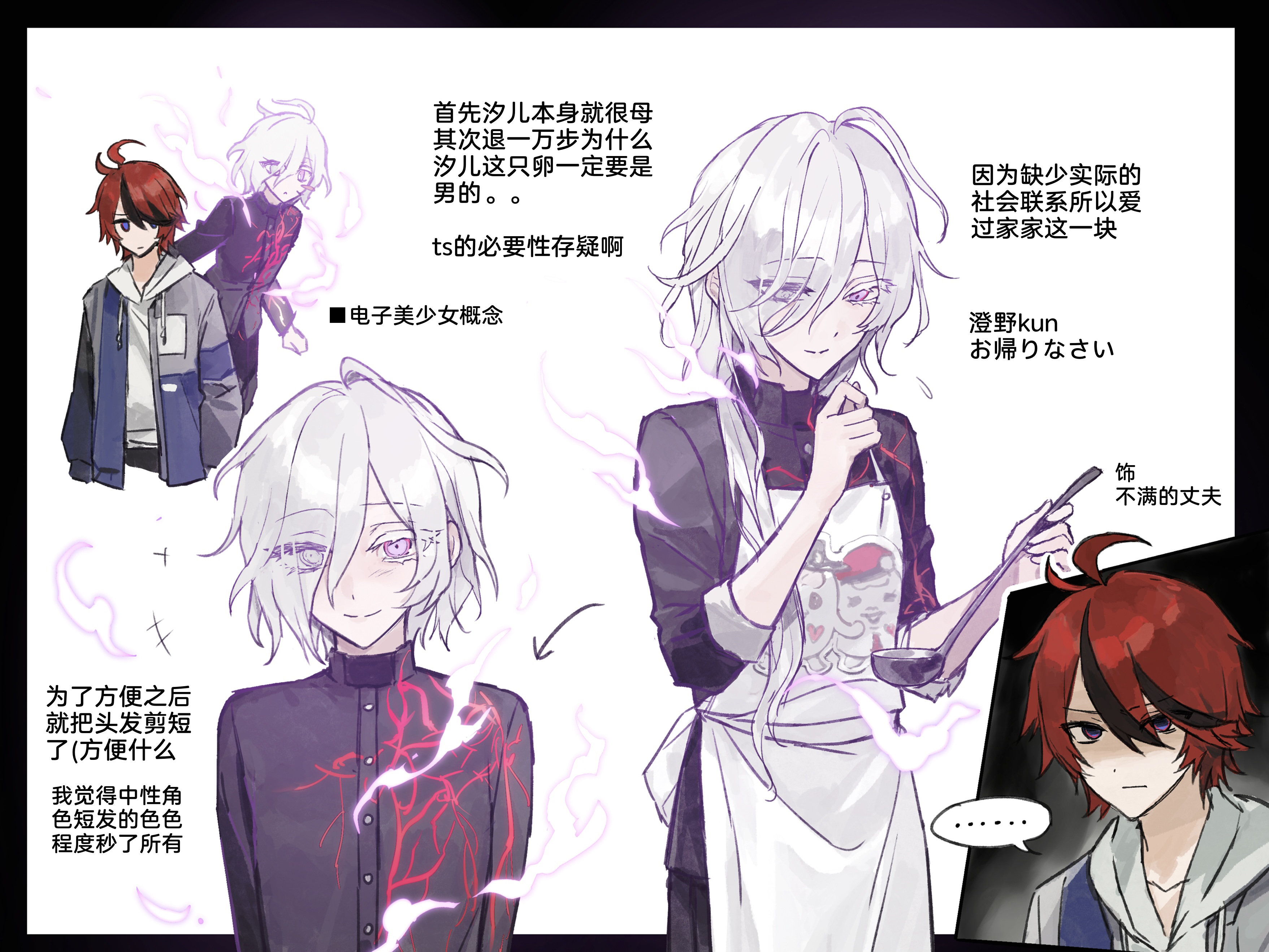 ... 1boy 1girl absurdres antenna_hair apron black_border black_hair black_jacket black_pants border character_print chinese_commentary chinese_text closed_mouth commentary_request eyes_visible_through_hair genderswap genderswap_(mtf) grey_jacket hair_over_one_eye highres hood hood_down hoodie jacket jacket_over_hoodie long_hair long_sleeves multicolored_hair multiple_views nigou_(hundred_line) open_clothes open_jacket pants pink_eyes red_hair shaded_face shion_(hundred_line) short_hair sirei_(hundred_line) sleeves_rolled_up smile speech_bubble spoken_ellipsis streaked_hair sumino_takumi the_hundred_line_-last_defense_academy- translation_request two-tone_hair white_apron white_background white_hair white_hoodie yough42