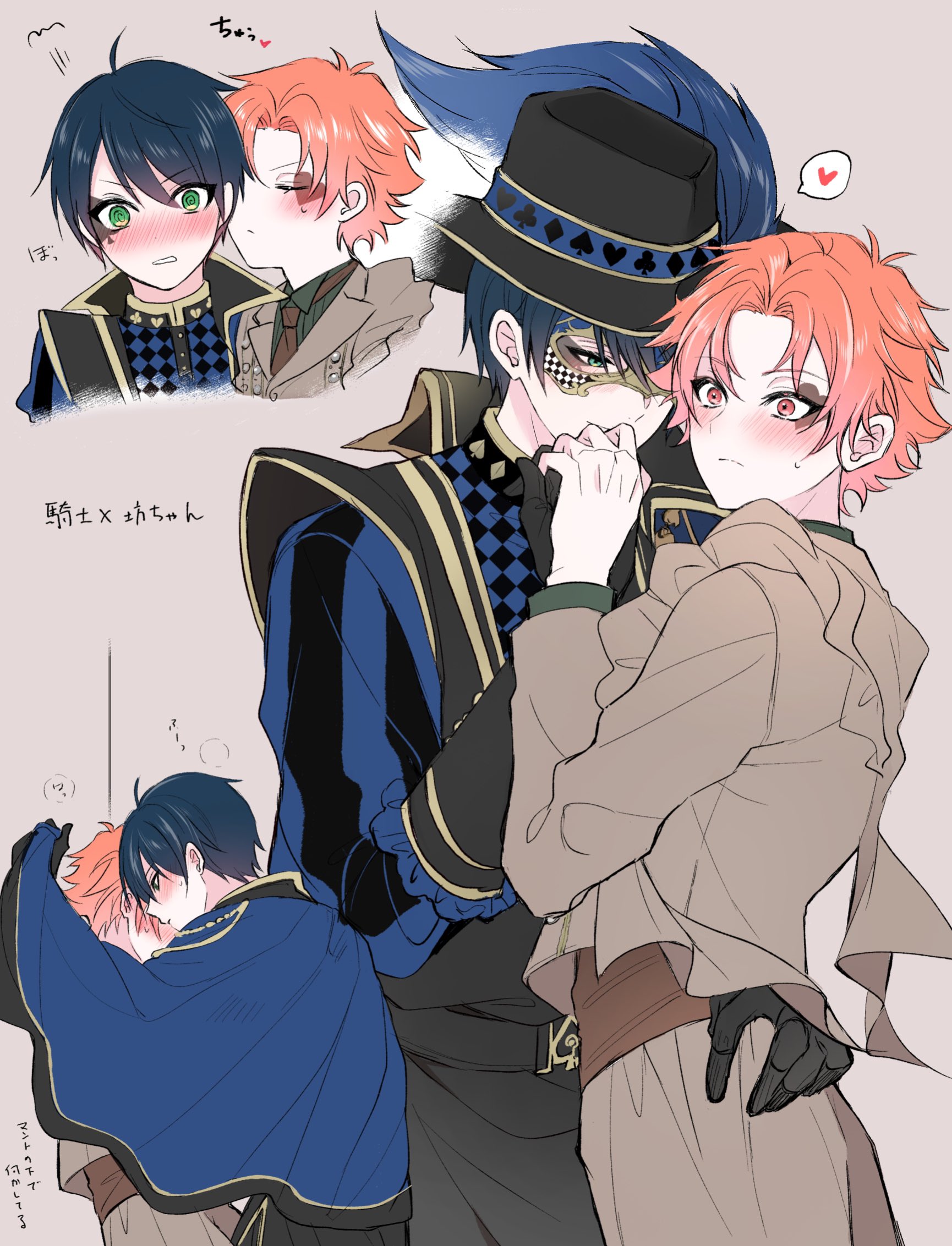 2boys ace_trappola ace_trappola_(luxe_couture) alternate_costume belt black_belt black_gloves blue_cape blush cape checkered_clothes closed_mouth club_(shape) collared_jacket curtained_hair deuce_spade deuce_spade_(masquerade) diamond_(shape) elbow_gloves facial_mark gloves green_eyes grey_background grey_pants grey_shirt hand_on_another's_ass hat heart highres jacket kiss kissing_cheek kissing_hand long_sleeves male_focus mask mofu_twst multiple_boys nervous_sweating orange_eyes pants parted_lips popped_collar shirt short_hair simple_background smile spade_(shape) speech_bubble spoken_heart standing striped_clothes striped_shirt sweat twisted_wonderland vertical-striped_clothes vertical-striped_shirt yaoi