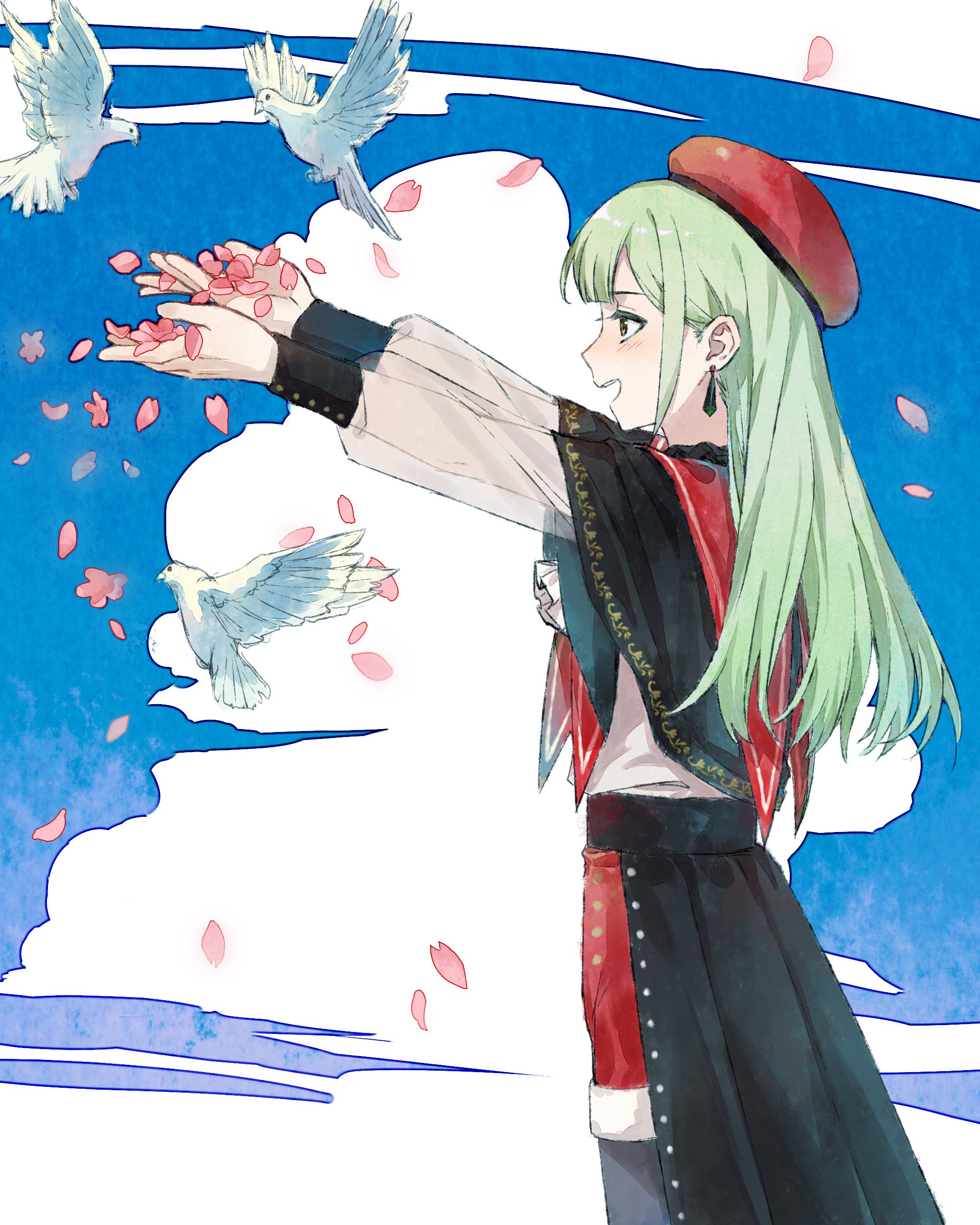1girl :d absurdres ascot bang_dream! bang_dream!_it's_mygo!!!!! beret bird black_capelet black_overskirt capelet chinese_commentary cloud cloudy_sky commentary_request cowboy_shot dove earrings falling_petals from_side green_hair hands_up hat highres holding holding_petal jewelry long_hair long_sleeves looking_ahead mortis_(bang_dream!) mortis_(costume)_(bang_dream!) open_mouth outstretched_arms petals pink_petals profile puffy_long_sleeves puffy_sleeves red_capelet red_hat red_shorts see-through_clothes see-through_sleeves shirt shorts sidelocks sky smile solo teeth upper_teeth_only wakaba_mutsumi white_ascot white_shirt yellow_eyes zx277x