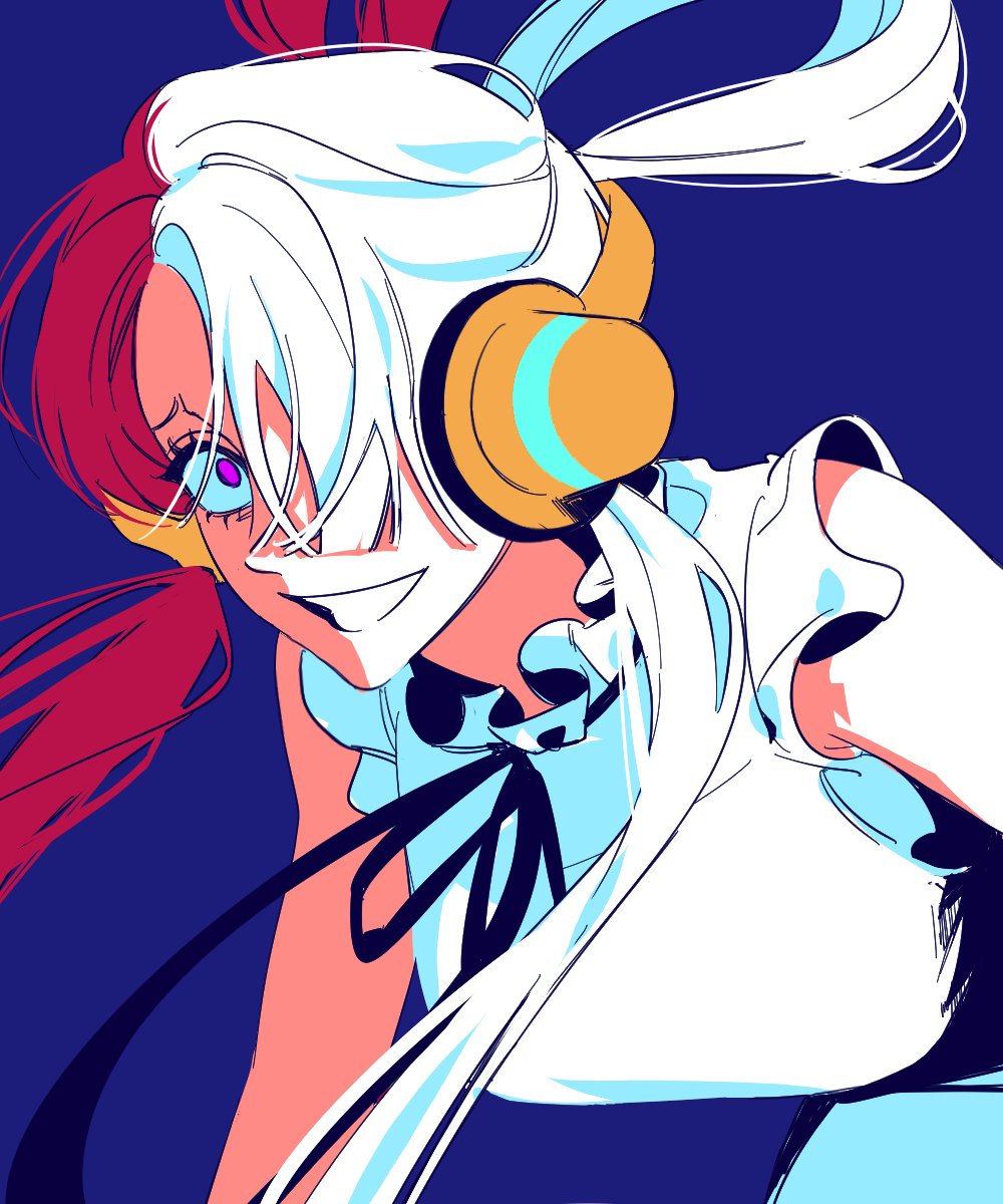 1girl black_ribbon blue_background dress hair_over_one_eye headphones highres looking_at_viewer multicolored_hair neck_ribbon one_piece one_piece_film:_red ppyobong11 purple_eyes red_hair ribbon simple_background sleeveless sleeveless_dress smile solo two-tone_hair upper_body uta_(one_piece) white_dress white_hair