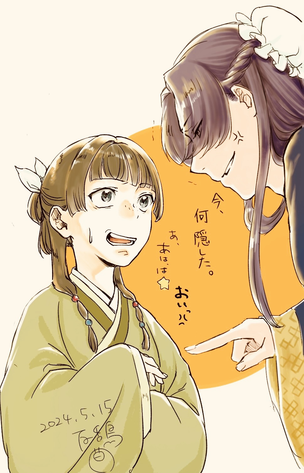 1boy 1girl anger_vein blunt_bangs braid brown_hair chinese_clothes dated eye_contact freckles hair_bun highres jinshi_(kusuriya_no_hitorigoto) kusuriya_no_hitorigoto long_hair looking_at_another maomao_(kusuriya_no_hitorigoto) pointing sweatdrop upper_body yoakedori914moz