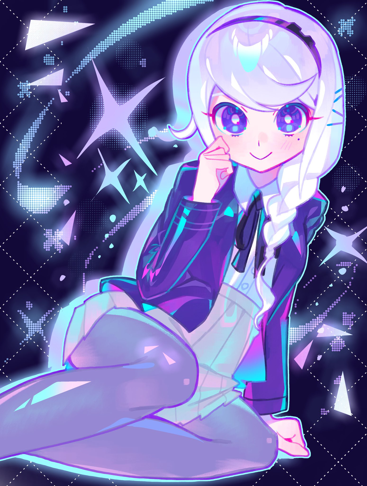 1girl black_background black_hairband black_ribbon braid bright_pupils buttons closed_mouth collared_shirt commentary feet_out_of_frame grey_pantyhose grey_skirt hair_ornament hairband hairclip hand_up highres iro_(mywife_sunny) jacket kirifuji_nozomi long_hair long_sleeves miniskirt mole mole_under_eye neck_ribbon pantyhose pleated_skirt purple_eyes purple_jacket ribbon shirt side_braid single_braid sitting skirt smile solo untranslatable_commentary the_hundred_line_-last_defense_academy- white_pupils white_shirt