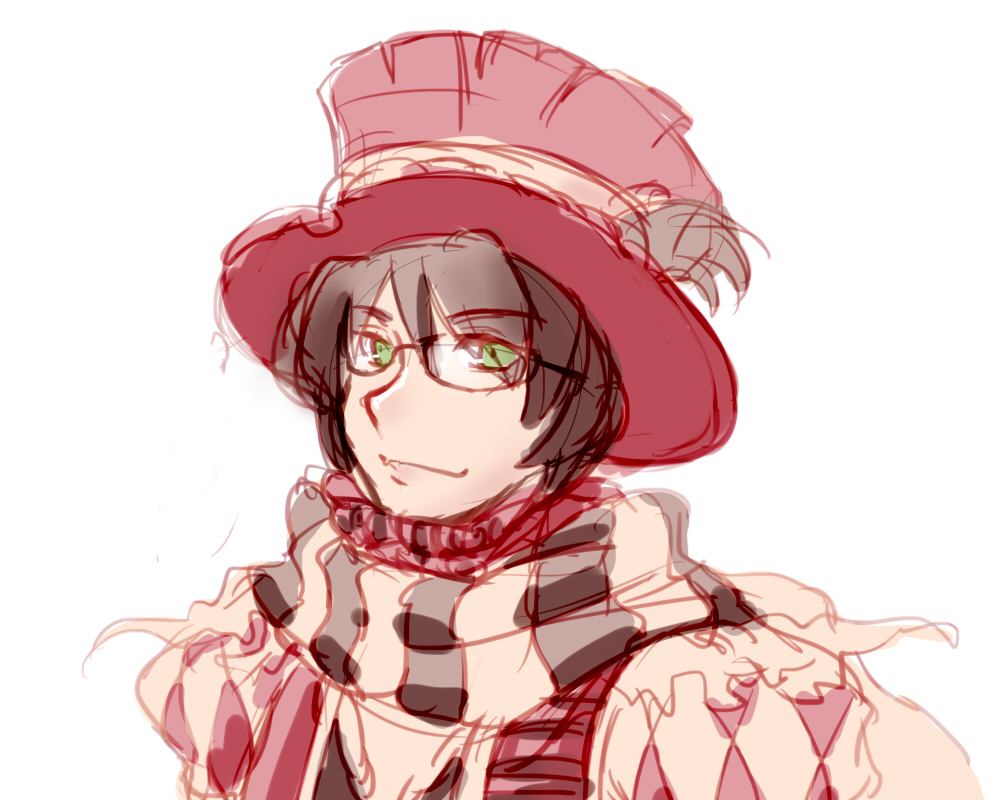 1boy black_scarf brown_hair closed_mouth commentary_request glasses green_eyes hat looking_at_viewer male_focus minstrel_(ragnarok_online) ragnarok_online red_hat red_scarf scarf short_hair simple_background smile solo striped_clothes striped_scarf upper_body white_background white_scarf yukimushi