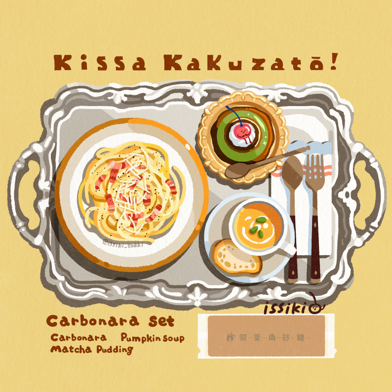 artist_name carbonara_(food) cherry english_text food food_focus fork fruit issiki_toaki no_humans original plate signature simple_background spoon still_life yellow_background