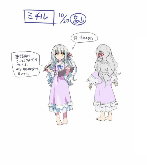 azure_striker_gunvolt azure_striker_gunvolt_2 commentary_request concept_art dress full_body grey_hair long_hair mytyl_(gunvolt) official_art purple_dress reference_sheet simple_background translation_request white_background yellow_eyes