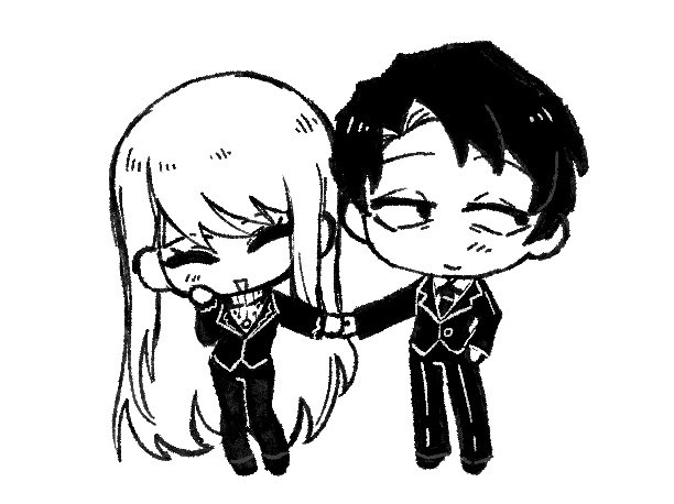 1boy 1girl angelica_(project_moon) bingoubing1 blush chibi closed_mouth collared_shirt full_body jacket jewelry lapels library_of_ruina long_hair long_sleeves looking_to_the_side necklace necktie notched_lapels open_mouth pants parted_bangs project_moon ribbed_sweater roland_(project_moon) shirt shoes sidelocks smile sweater very_long_hair