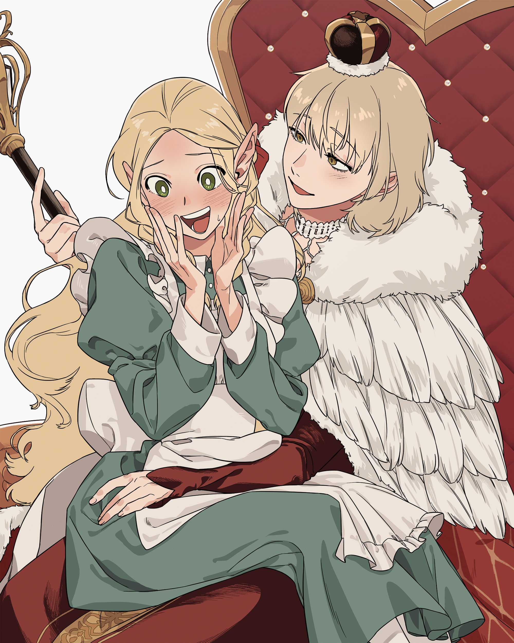 2girls absurdres apron blonde_hair blush brown_eyes choker cloak commentary crown dungeon_meshi elf english_commentary falin_touden falin_touden_(tallman) feathered_cloak frilled_apron frills fur-trimmed_cloak fur_trim green_eyes hand_on_another's_lap hands_on_own_face highres holding holding_scepter long_hair maid maid_apron marcille_donato mini_crown multiple_girls on_throne pointy_ears scepter sitting sitting_on_lap sitting_on_person smile throne ttal_ttal very_long_hair yuri