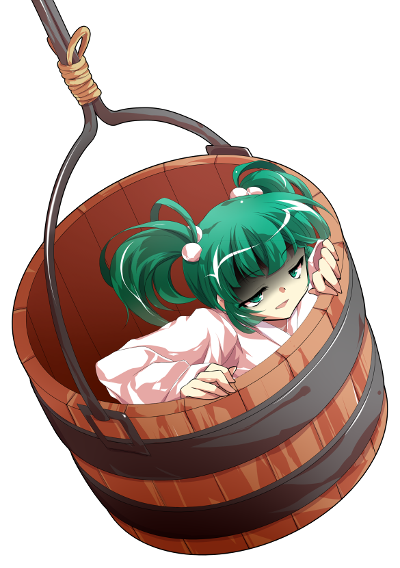 1girl alphes_(style) bucket commentary_request dairi full_body green_eyes green_hair hair_bobbles hair_ornament in_bucket in_container japanese_clothes jitome kimono kisume large_variant_set long_sleeves open_mouth parody shaded_face short_hair solo style_parody tachi-e touhou transparent_background twintails variant_set white_kimono wooden_bucket