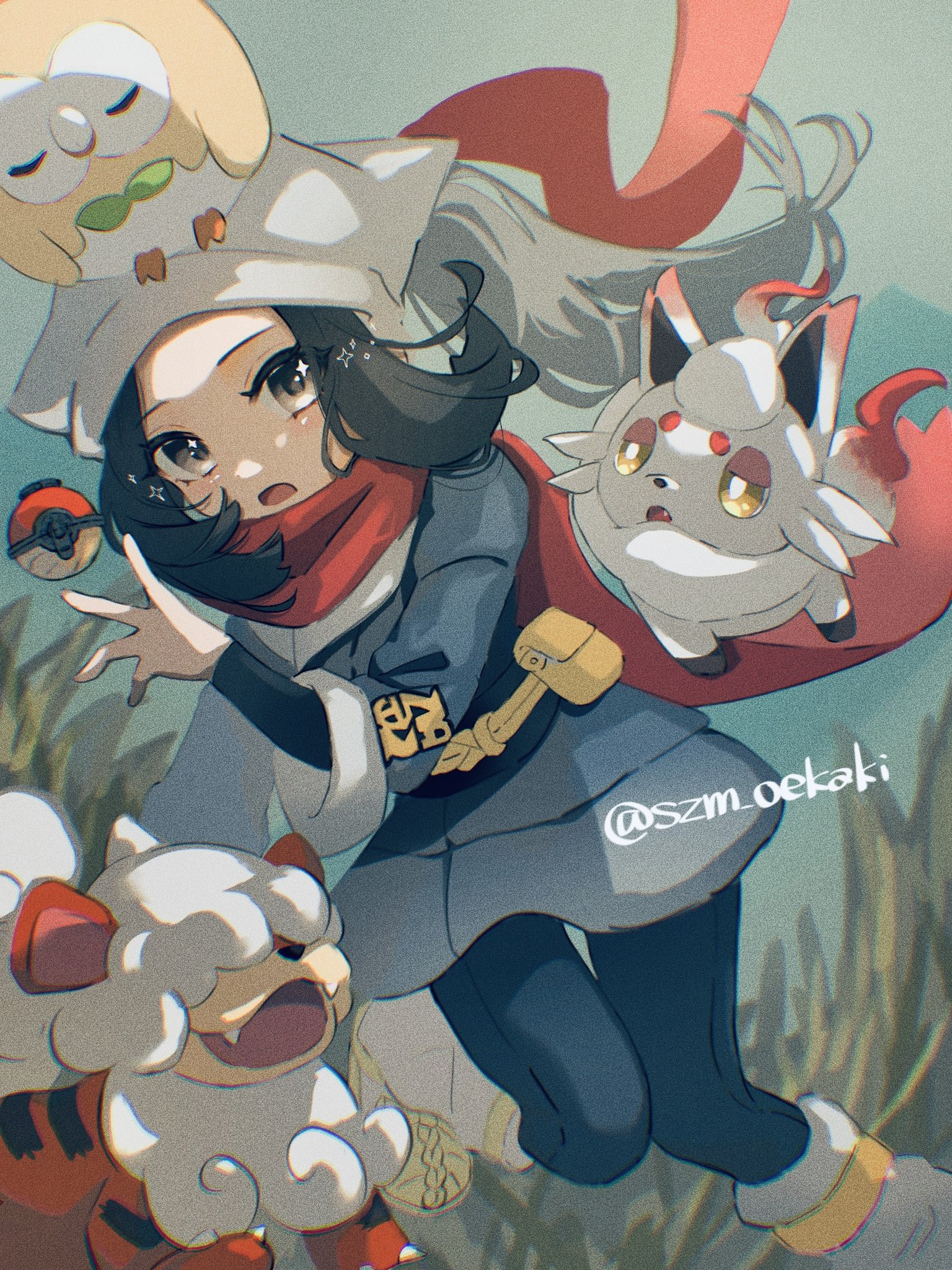 1girl akari_(pokemon) black_hair black_sash floating_scarf galaxy_expedition_team_survey_corps_uniform gen_7_pokemon headscarf highres hisuian_growlithe hisuian_poke_ball hisuian_zorua leg_up loose_socks nintendo poke_ball pokemon pokemon_(creature) pokemon_legends:_arceus red_scarf rowlet sash scarf socks star_(symbol) star_in_eye symbol_in_eye szm_oekaki white_headscarf