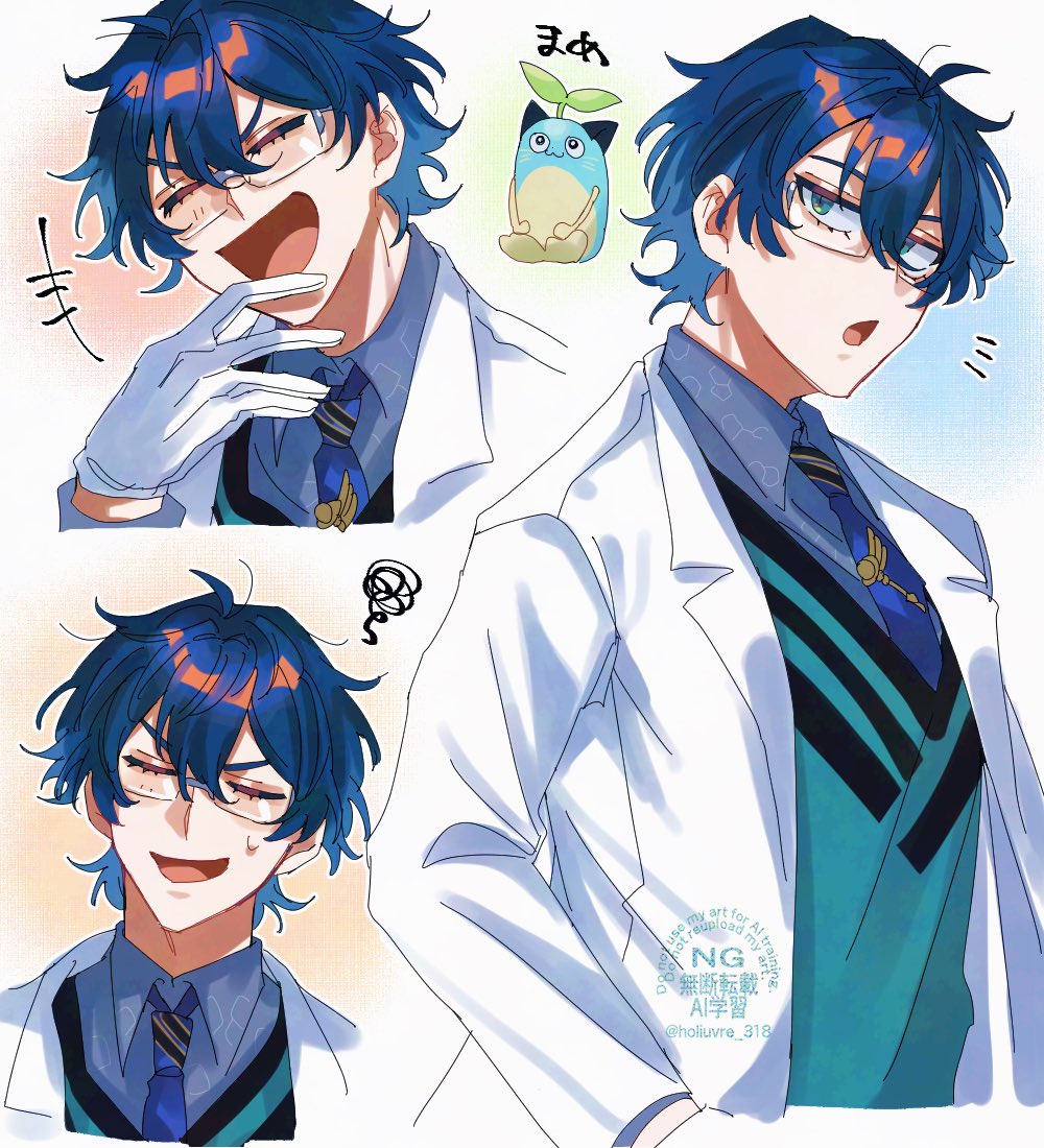 1boy aqua_eyes aqua_sweater_vest blue_hair blue_necktie closed_eyes coat commentary glasses gloves grey_shirt holiuvre_318 lab_coat laughing leos_vincent leos_vincent_(1st_costume) male_focus mameneko_(leos_vincent) multiple_views necktie nijisanji notice_lines open_clothes open_coat shirt short_hair small_sweatdrop smile sweater_vest untranslatable_commentary tie_clip twitter_username virtual_youtuber white_coat white_gloves