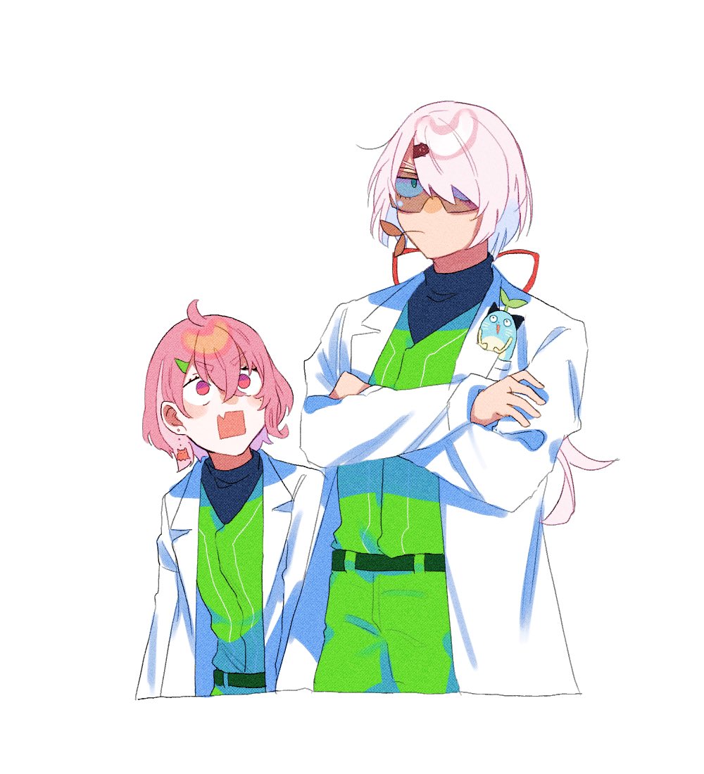 1boy 1girl animal animal_in_clothes aqua_eyes belt borrowed_hairstyle coat crossed_arms earrings floating_earrings green_pants green_shirt hair_ornament hairclip holiuvre_318 jewelry lab_coat leos_vincent long_hair mameneko_(leos_vincent) mouth_hold nijisanji pants pink_eyes pink_hair red_ribbon ribbon sasaki_saku shiina_yuika shirt shirt_tucked_in short_hair stalk_in_mouth undershirt virtual_youtuber white_coat white_hair wig