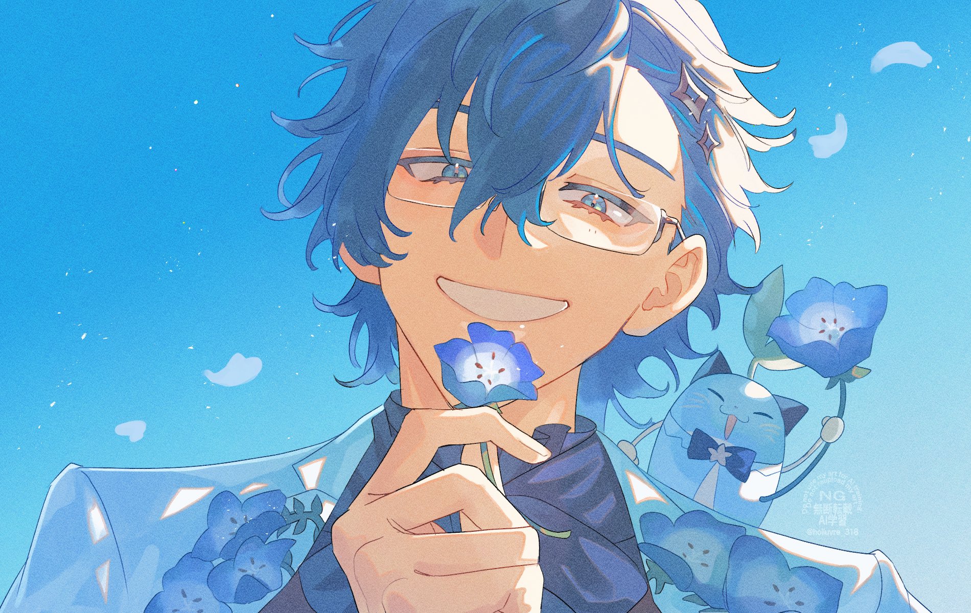 1boy animal animal_on_shoulder aqua_eyes blue_hair blue_sky closed_eyes falling_petals flower flower_request glasses hair_between_eyes hair_ornament hairpin hand_up highres holding holding_flower holiuvre_318 jacket leos_vincent looking_at_viewer male_focus mameneko_(leos_vincent) nijisanji petals portrait short_hair sky smile solo teeth twitter_username virtual_youtuber white_jacket
