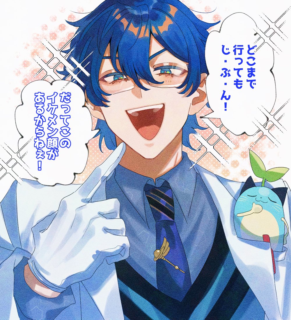 1boy animal animal_in_clothes aqua_sweater_vest blue_hair blue_necktie closed_eyes collared_shirt glasses gloves grey_hair hand_up holiuvre_318 leos_vincent leos_vincent_(1st_costume) looking_at_viewer male_focus mameneko_(leos_vincent) necktie nijisanji object_in_pocket pen_in_pocket pocket shirt smile solo speech_bubble straight-on sweater_vest teeth translation_request upper_body upper_teeth_only virtual_youtuber white_gloves