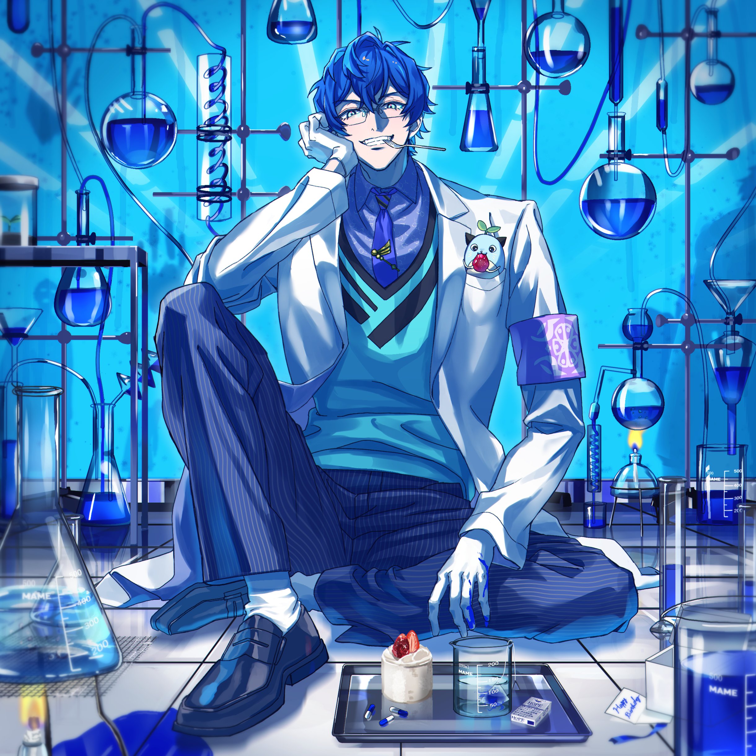 1boy absurdres animal animal_in_clothes aqua_eyes aqua_sweater_vest armband beaker black_shoes blue_hair blue_necktie blue_pants box bunsen_burner coat flask food fork fruit gift gift_box gloves grey_shirt hand_on_own_face happy_birthday highres kayano_(kayanoakira01) lab_coat leos_vincent leos_vincent_(1st_costume) looking_at_viewer male_focus mameneko_(leos_vincent) necktie nijisanji pants pill pinstripe_pants pinstripe_pattern purple_armband shirt shoes short_hair sitting smile solo strawberry sweater_vest teeth tray utensil_in_mouth vial virtual_youtuber white_coat white_gloves