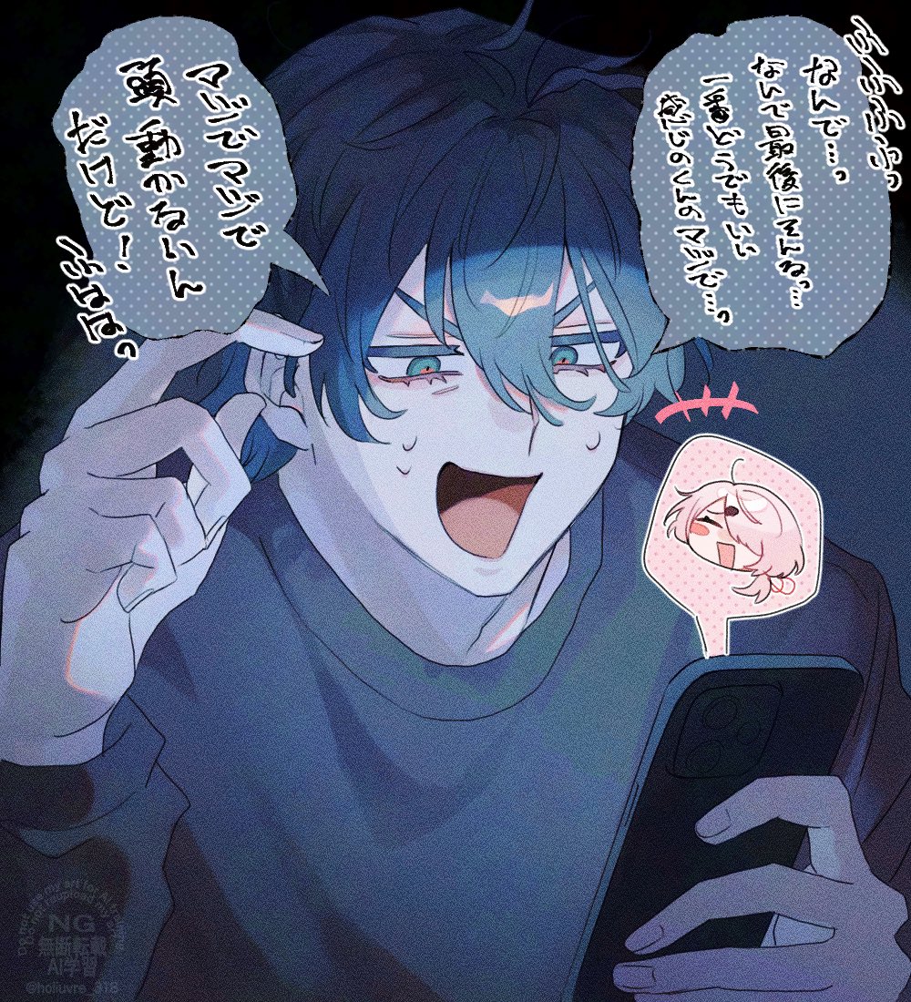 1boy black_shirt blue_hair blush_stickers cellphone closed_eyes commentary hair_between_eyes hair_over_one_eye holding holding_phone holiuvre_318 leos_vincent male_focus nijisanji open_mouth phone pink_hair shiina_yuika shirt short_hair single_blush_sticker speech_bubble spoken_character sweat untranslatable_commentary translation_request twitter_username upper_body virtual_youtuber