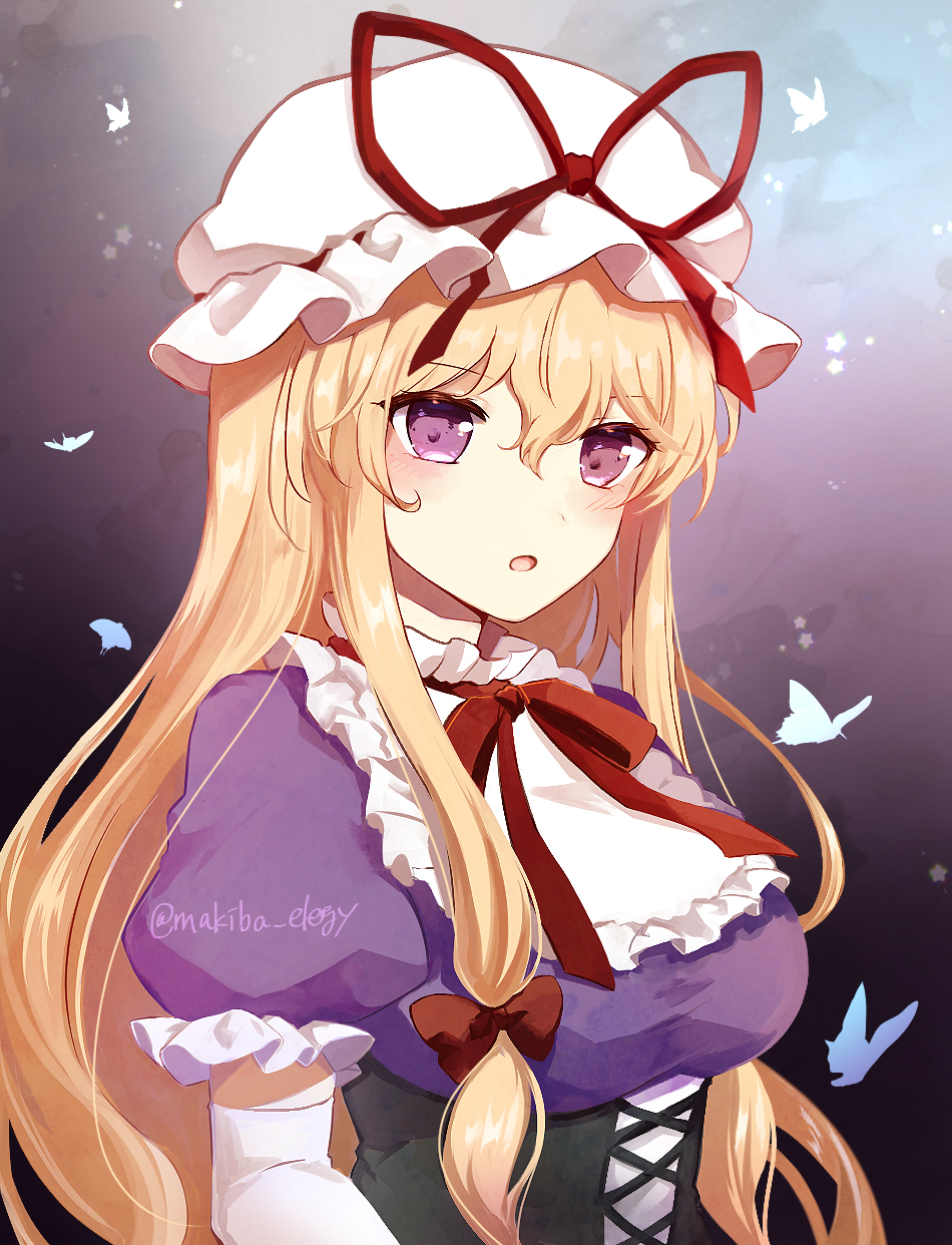 blonde_hair blush bug butterfly corset dress elbow_gloves frills gloves gradient_background hair_between_eyes hair_ribbon hat highres insect koto_(shiberia39) looking_at_viewer mob_cap open_mouth purple_dress purple_eyes ribbon short_sleeves touhou upper_body white_gloves yakumo_yukari