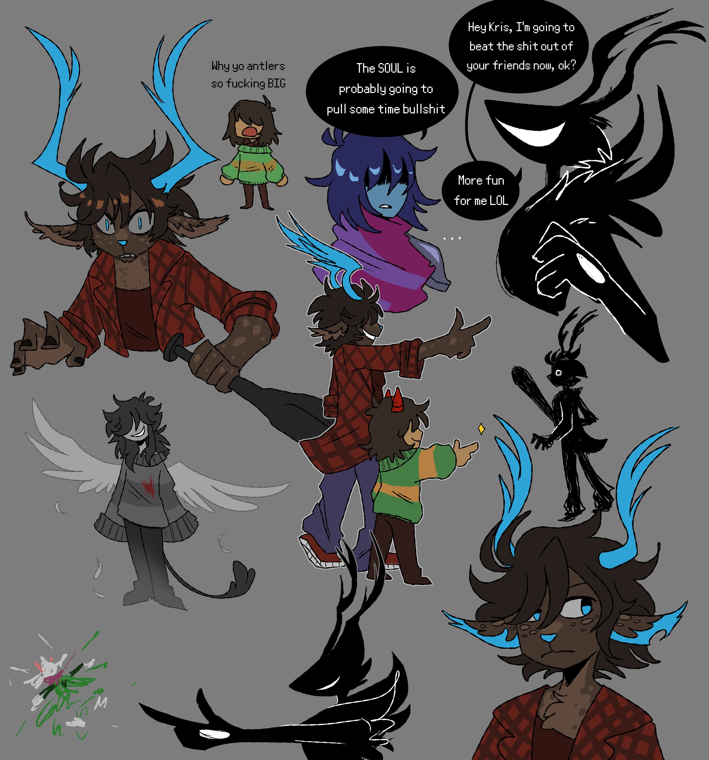 ... 1boy 1girl 1other absurdres androgynous animal_ears animal_nose antlers armor baseball_bat black_armor blue_eyes blue_horns blue_pants blue_skin brown_fur brown_hair colored_skin commentary december_holiday deer_antlers deer_ears deer_girl deltarune design_speculation english_commentary english_text evil_smile expressionless fake_horns feathered_wings furry furry_female green_sweater hair_between_eyes heart highres holding holding_baseball_bat horns jacket kris_(dark_world)_(deltarune) kris_(deltarune) medium_hair messy_hair moonpaw17 multiple_views no_eyes pants pointing ralsei red_jacket red_scarf roaring_knight scarf short_hair simple_background smile soul_(deltarune) speech_bubble spoilers spotted_fur sweater utdr_(toby_fox) wings