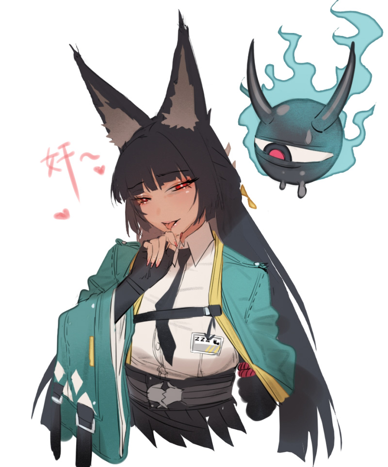 agaver123 animal_ears black_gloves black_hair black_necktie black_skirt blue_jacket collared_shirt fingerless_gloves fox_ears fox_girl gloves hoshimi_miyabi jacket long_hair looking_at_viewer necktie pointy_ears red_eyes shirt skirt smile solo tailless_(zenless_zone_zero) tongue tongue_out very_long_hair white_shirt zenless_zone_zero