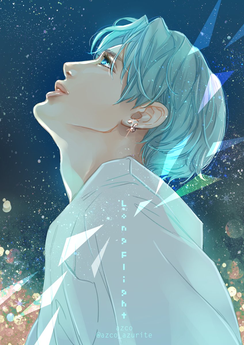 1boy azco_azconia blue_eyes blue_hair commentary earrings english_commentary eyelashes glint highres jewelry k-pop looking_up male_focus nct_(band) parted_lips profile real_life shirt short_hair solo taeyong twitter_username upper_body white_shirt