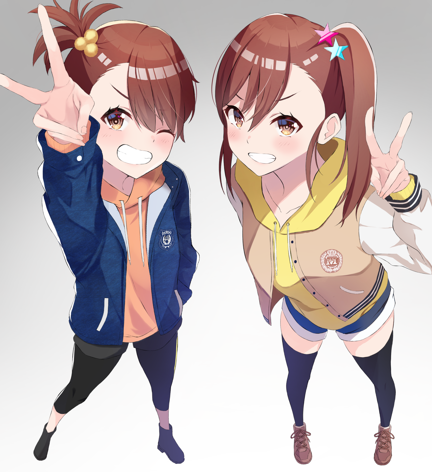 2girls arm_up black_shoes black_shorts black_thighhighs blue_jacket blue_shorts brown_eyes brown_hair brown_shoes fingernails foreshortening full_body futami_ami futami_mami gradient_background grin hair_bobbles hair_ornament highres hood hood_down hooded_jacket idolmaster idolmaster_(classic) irohakaede jacket letterman_jacket looking_at_viewer multiple_girls one_eye_closed open_clothes open_jacket shoes short_hair shorts siblings side_ponytail sisters smile standing star_(symbol) star_hair_ornament thighhighs twins v