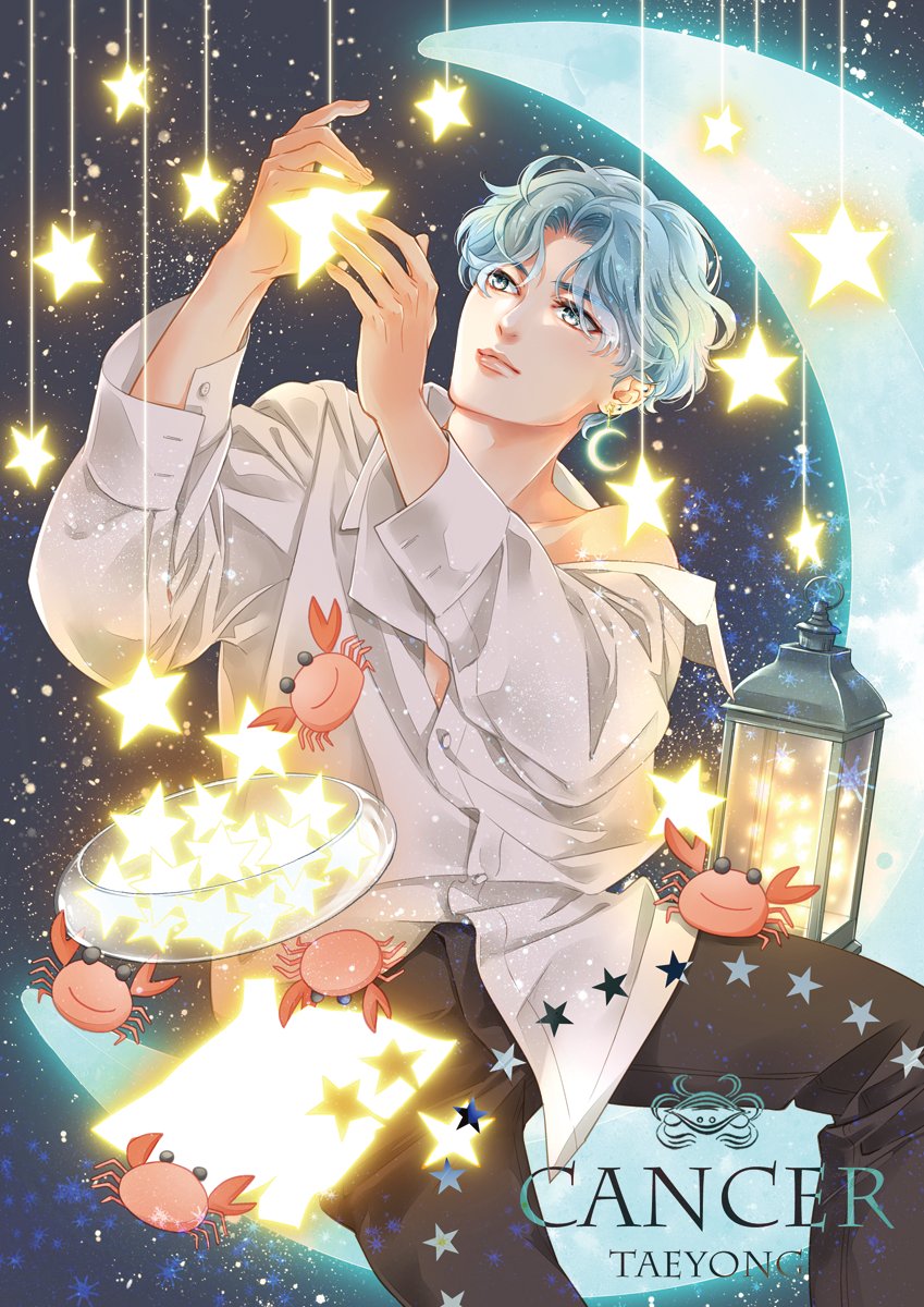 1boy azco_azconia black_pants blue_hair character_name closed_mouth commentary crab earrings english_commentary highres jewelry lantern male_focus moon nct_(band) pants real_life shirt short_hair single_bare_shoulder sitting star_(symbol) taeyong white_shirt