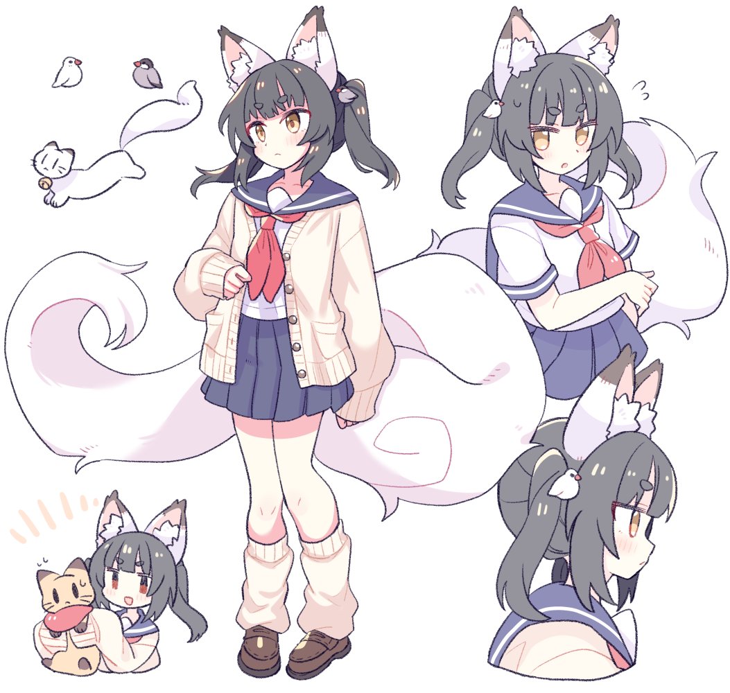 1girl animal animal_ear_fluff animal_ears animalization bell bird bird_hair_ornament black_hair blue_sailor_collar blue_skirt brown_shoes cardigan flying_sweatdrops fox fox_ears fox_girl fox_tail full_body hair_ornament holding holding_animal jingle_bell leg_warmers loafers medium_hair miniskirt multiple_tails multiple_views neck_bell neckerchief open_cardigan open_clothes open_mouth original person_and_animalization pleated_skirt red_eyes red_neckerchief sailor_collar school_uniform serafuku shirt shoes short_eyebrows short_sleeves simple_background skirt smile suzuno_(suzuno3110) tail thick_eyebrows twintails two_tails white_background white_leg_warmers white_shirt yellow_eyes
