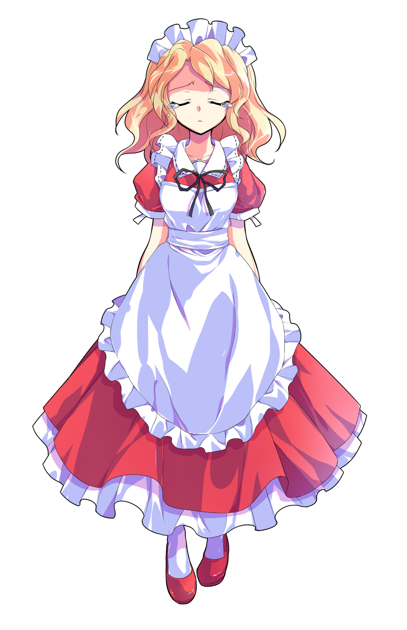 1girl apron arms_at_sides black_ribbon closed_eyes closed_mouth collarbone collared_dress commentary_request dairi dress frilled_apron frills full_body highres large_variant_set long_dress long_hair looking_at_viewer maid maid_headdress neck_ribbon orange_hair parted_bangs pigeon-toed raised_inner_eyebrows red_dress red_shoes ribbon shoes short_sleeves sidelocks simple_background socks solo standing straight-on tachi-e tearing_up touhou touhou_(pc-98) transparent_background variant_set wavy_hair white_apron white_socks yumeko_(touhou)