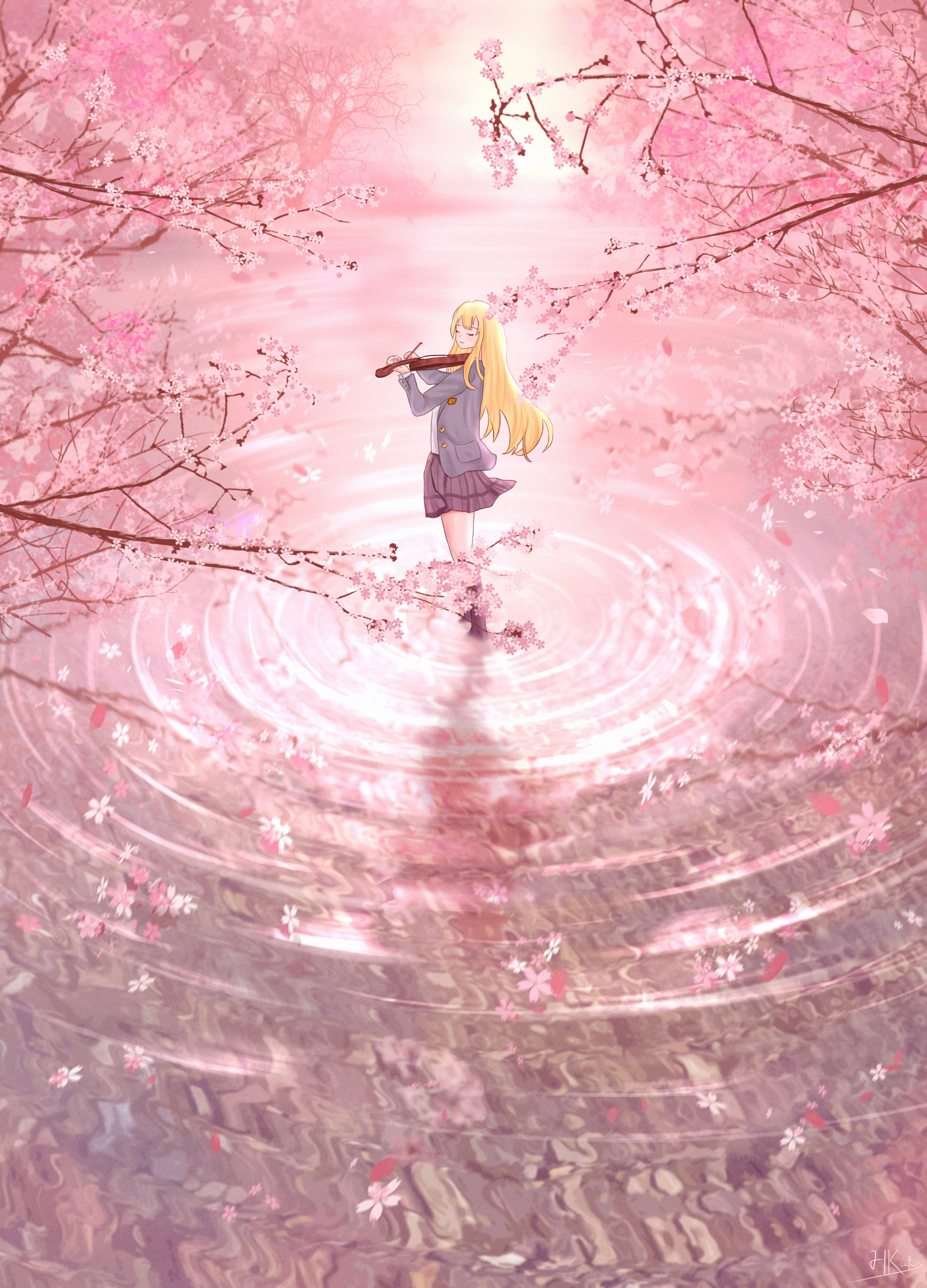 1girl absurdres black_socks blonde_hair bow_(music) cherry_blossoms cherry_tree chinese_commentary closed_eyes closed_mouth commentary_request double-parted_bangs falling_flower falling_petals floating_hair flower grey_jacket highres hkcutie holding holding_bow_(music) instrument jacket kneehighs lake light_blush light_smile long_hair miyazono_kawori music petals pink_flower pink_skirt pink_theme plaid_clothes plaid_skirt playing_instrument pleated_skirt reflection reflective_liquid ripples school_uniform shigatsu_wa_kimi_no_uso shirt skirt socks standing tree violin wading white_shirt wide_shot