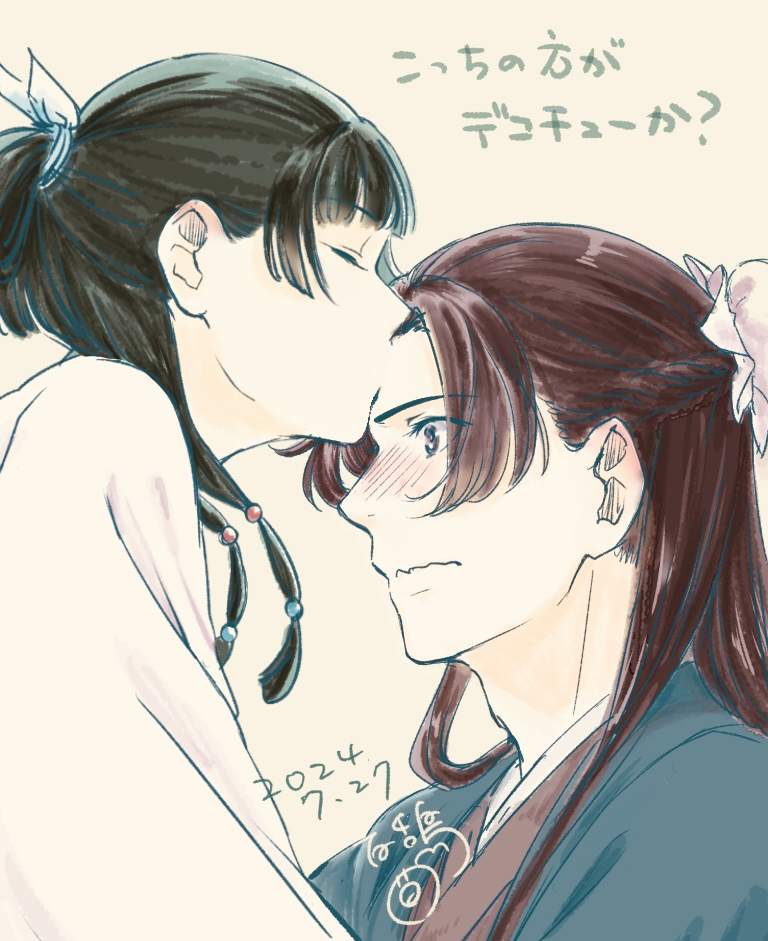 1boy 1girl black_hair blush brown_hair bun_cover closed_eyes dated flustered hetero jinshi_(kusuriya_no_hitorigoto) kiss kissing_forehead kusuriya_no_hitorigoto looking_at_another maomao_(kusuriya_no_hitorigoto) simple_background upper_body yoakedori914moz