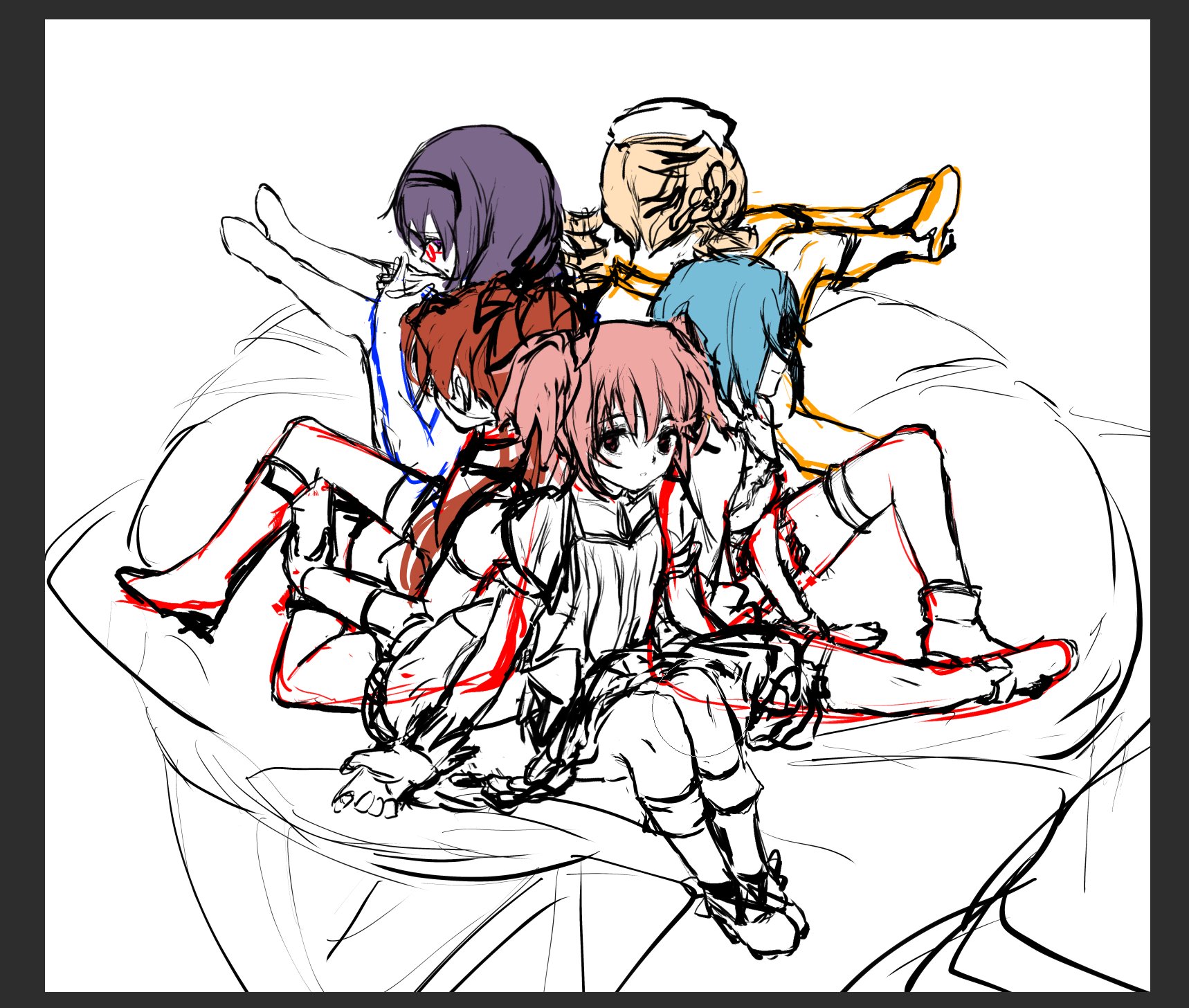 5girls akemi_homura black_hair blue_hair blush drill_hair high_ponytail highres kaname_madoka llbzqsj mahou_shoujo_madoka_magica medium_hair miki_sayaka multiple_girls outline pink_hair ponytail red_hair red_outline sakura_kyoko short_twintails sitting spot_color tomoe_mami twin_drills twintails