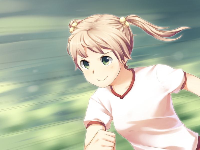 1girl artist_request blonde_hair blurry blurry_background closed_mouth game_cg green_eyes hair_bobbles hair_ornament ibarazaki_emi katawa_shoujo medium_hair motion_blur non-web_source shirt short_sleeves smile solo twintails upper_body v-shaped_eyebrows white_shirt