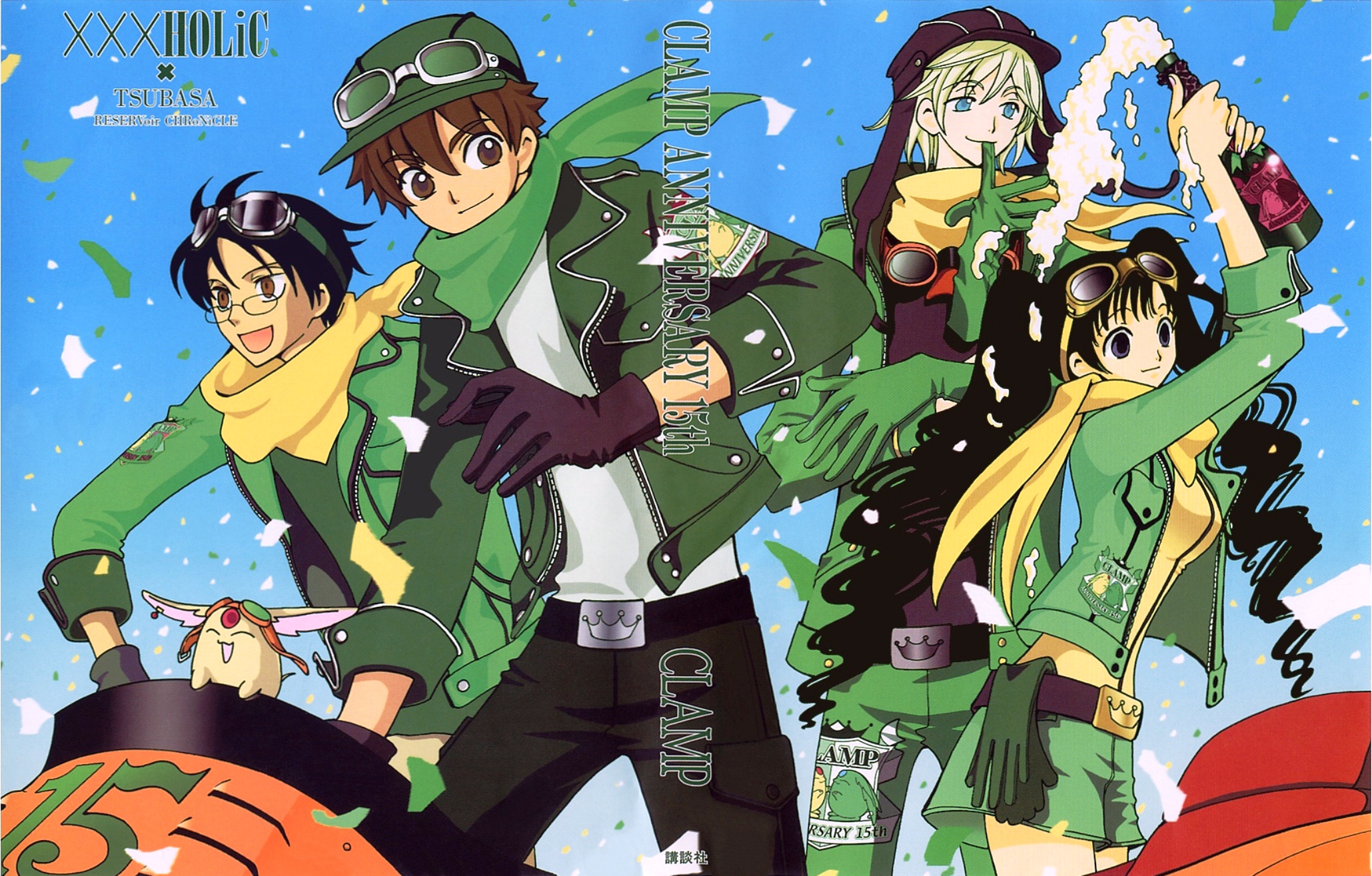 1girl 3boys alcohol anniversary aviator_goggles belt black_belt blue_sky brown_eyes champagne champagne_bottle clamp_(circle) confetti crossover fai_d._flowright glove_in_mouth gloves goggles goggles_around_neck goggles_on_head goggles_on_headwear green_gloves green_scarf green_vest highres kunogi_himawari li_syaoran mokona mouth_hold multiple_boys scarf sky tsubasa_chronicle vest watanuki_kimihiro xxxholic yellow_scarf