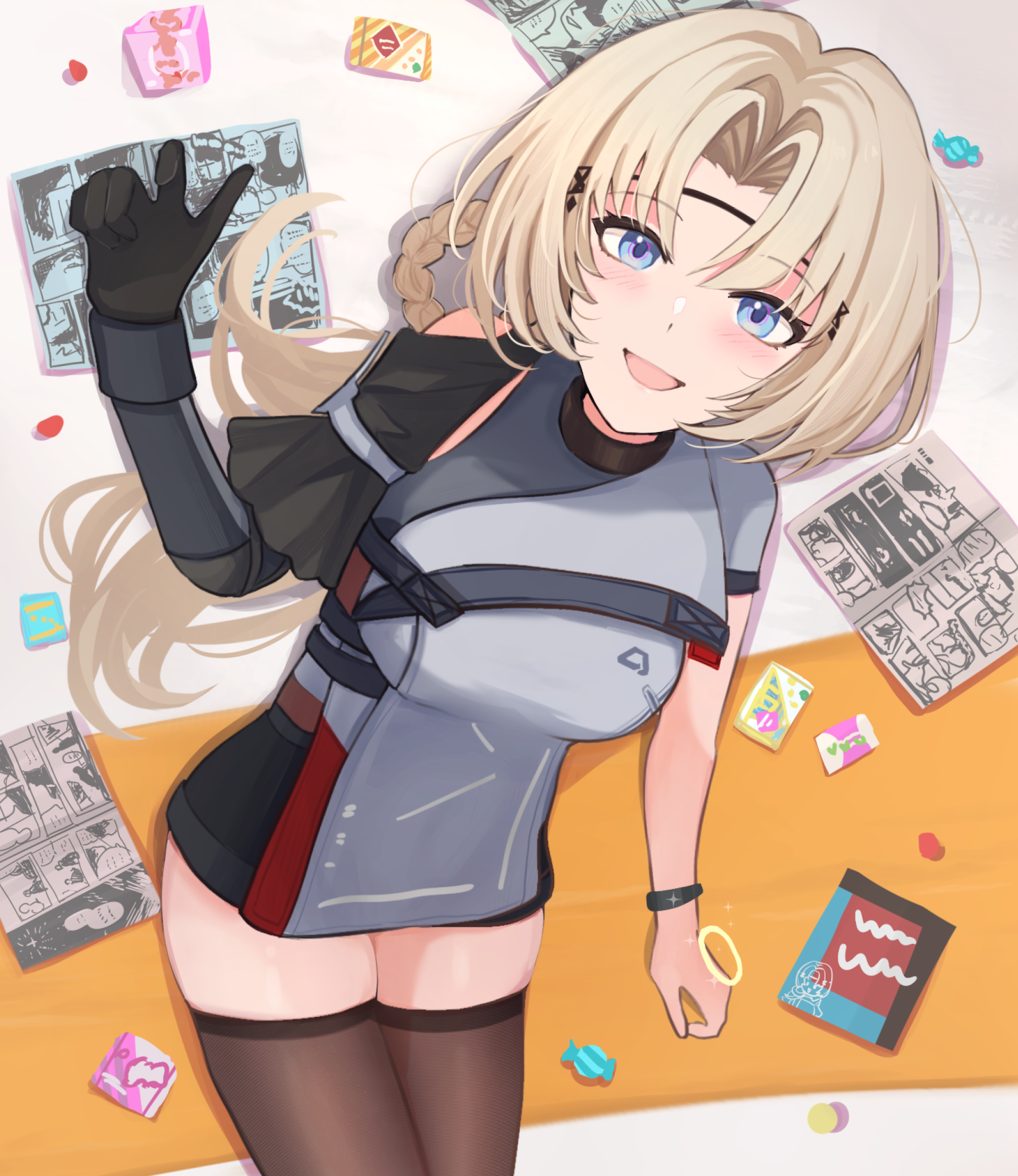 1girl asymmetrical_sleeves black_gloves black_shorts black_thighhighs blonde_hair blue_eyes candy covenant_halo_(girls'_frontline_2) elmo_dormitory_outfit food forehead girls'_frontline girls'_frontline_2:_exilium gloves hair_rings highres light_blush looking_at_viewer lying manga_(object) mixed-language_commentary on_back open_mouth parted_bangs shorts single_glove single_hair_ring smile solo thighhighs thighs ullrid_(girls'_frontline_2) wrapped_candy wristband yotsuyama_(yomo8ama)