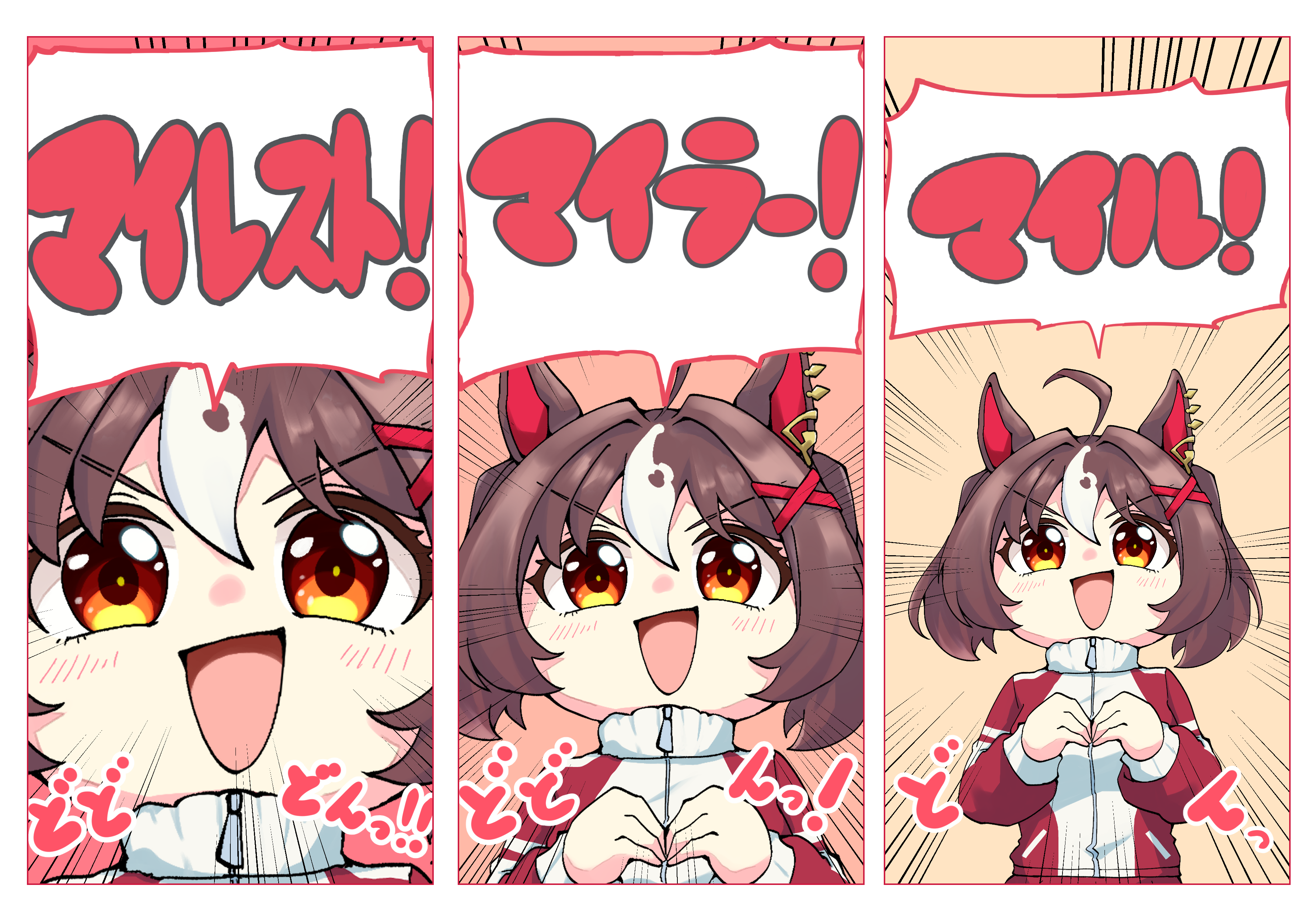 1girl absurdres ahoge animal_ears brown_hair collarbone commentary_request emphasis_lines gran_alegria_(umamusume) hair_between_eyes hair_ornament highres horse_girl jacket looking_at_viewer muchi3333 open_mouth red_eyes simple_background solo track_jacket translated umamusume x_hair_ornament