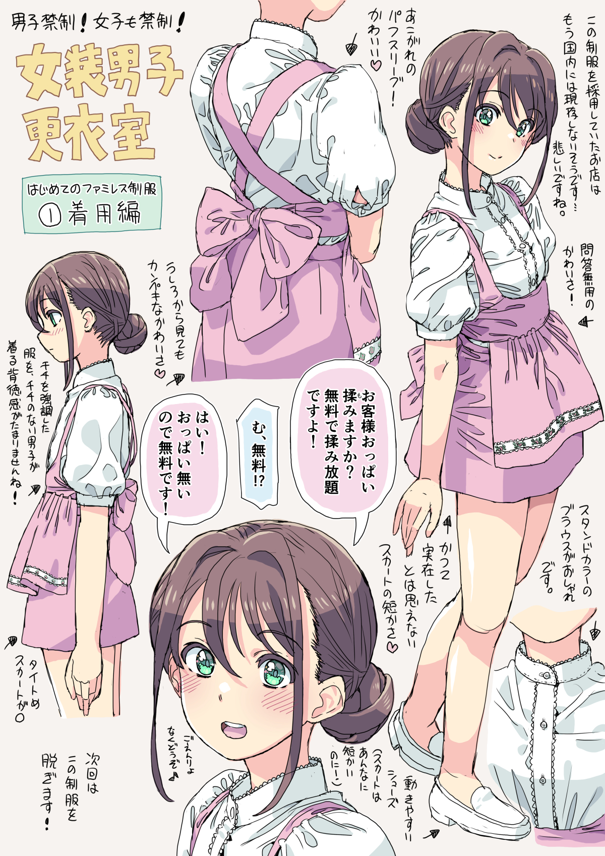 1boy anna_miller apron arrow_(symbol) blouse blush bodice brown_hair check_commentary commentary_request crossdressing crossdressing_(mtf) frilled_shirt_collar frills green_eyes hair_bun heart highres homing_(areya) long_hair male_focus miniskirt multiple_views open_mouth original pink_apron pink_background pink_skirt shirt shoes skirt solo trap waitress white_shirt white_shoes