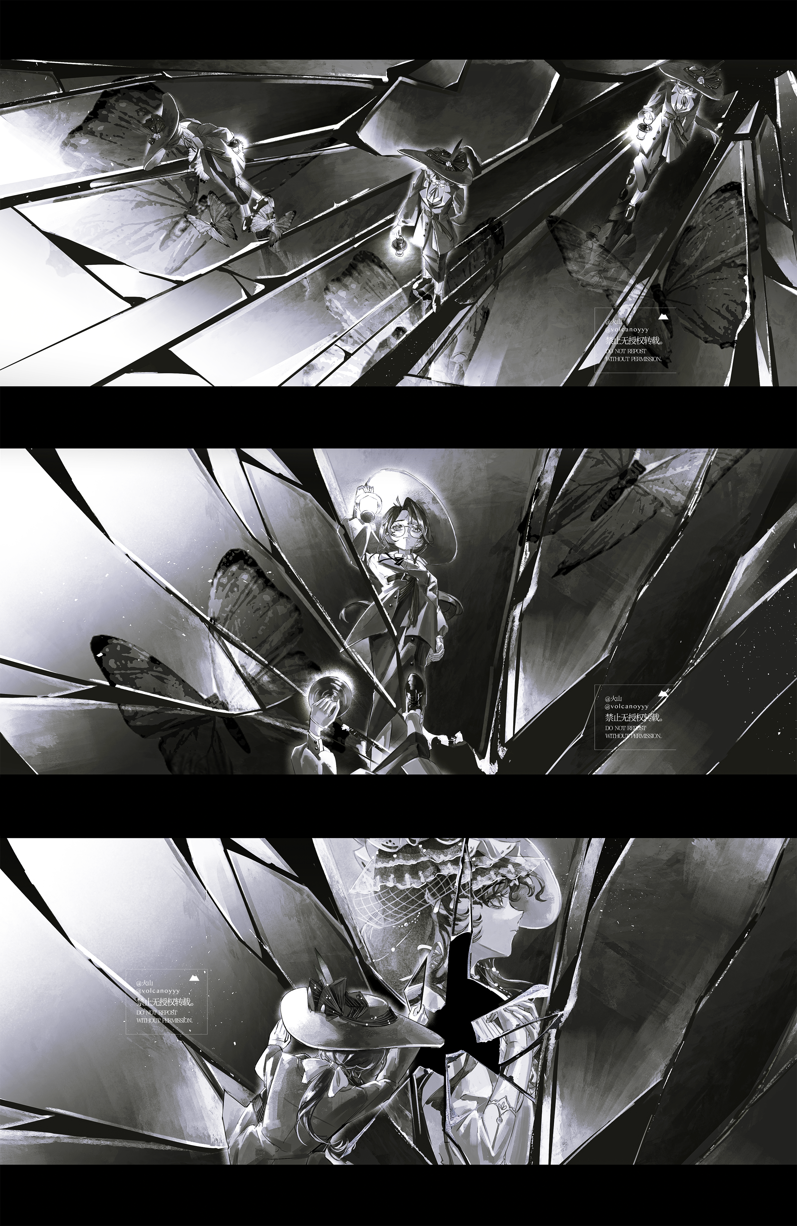 2girls absurdres bow broken_glass broken_mirror bug butterfly clone different_reflection glass glass_shards glasses greyscale hair_bow highres holding holding_lantern insect isolde_(reverse:1999) jacket kakania_(reverse:1999) lantern long_skirt low_ponytail mirror monochrome multiple_girls picture_hat ponytail profile reflection reverse:1999 shoes skirt volcanoyyy walking watermark