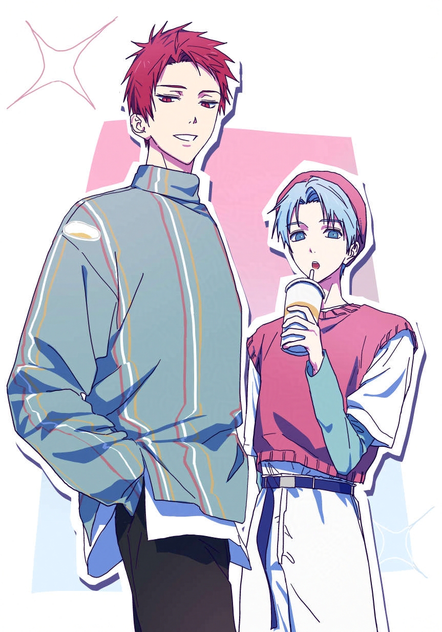 2boys akashi_seijuurou alternate_costume belt belt_buckle black_belt black_pants blue_eyes blue_hair buckle cup curtained_hair disposable_cup dot_nose drinking_straw grin hand_in_pocket hat highres holding holding_cup kuroko_no_basuke kuroko_tetsuya layered_clothes long_sleeves male_focus multiple_boys open_mouth pants red_eyes red_hair red_hat red_sweater_vest shirt short_sleeves smile sparkle standing sweater_vest teeth tt_am618 white_pants white_shirt