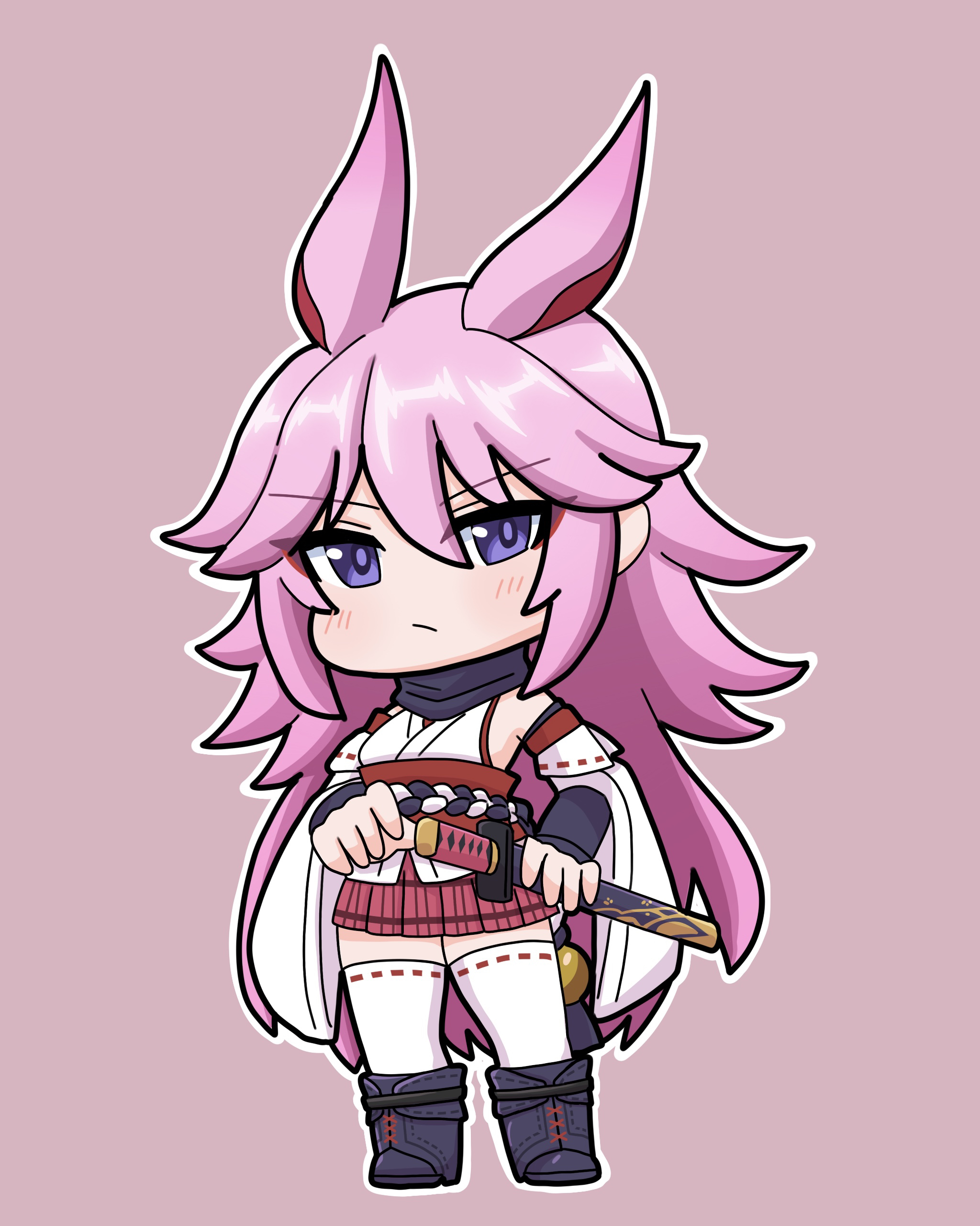1girl absurdres bare_shoulders blush boots brown_background chibi closed_mouth detached_sleeves full_body hair_between_eyes highres holding holding_sheath honkai_(series) honkai_impact_3rd japanese_clothes katana kimono knee_boots long_sleeves mokkyo_(motkyo) obi outline pink_hair pink_skirt pleated_skirt purple_eyes ribbon-trimmed_thighhighs ribbon_trim sash sheath sheathed simple_background skirt sleeveless sleeveless_kimono solo standing sword thighhighs thighhighs_under_boots v-shaped_eyebrows weapon white_kimono white_outline white_thighhighs wide_sleeves yae_sakura yae_sakura_(gyakushinn_miko)