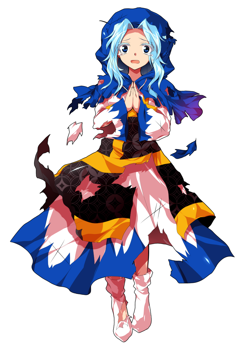 1girl alphes_(style) blue_eyes blue_hair blue_hood clenched_hands commentary_request crying crying_with_eyes_open dairi dress frills full_body hands_up highres holding hood hood_up hoop jewelry kesa kumoi_ichirin large_variant_set long_hair long_sleeves looking_at_viewer multicolored_dress necklace own_hands_clasped own_hands_together parody pendant smile socks solo standing style_parody tachi-e tears torn_clothes torn_dress torn_hood torn_sleeves torn_socks touhou transparent_background variant_set wide_sleeves