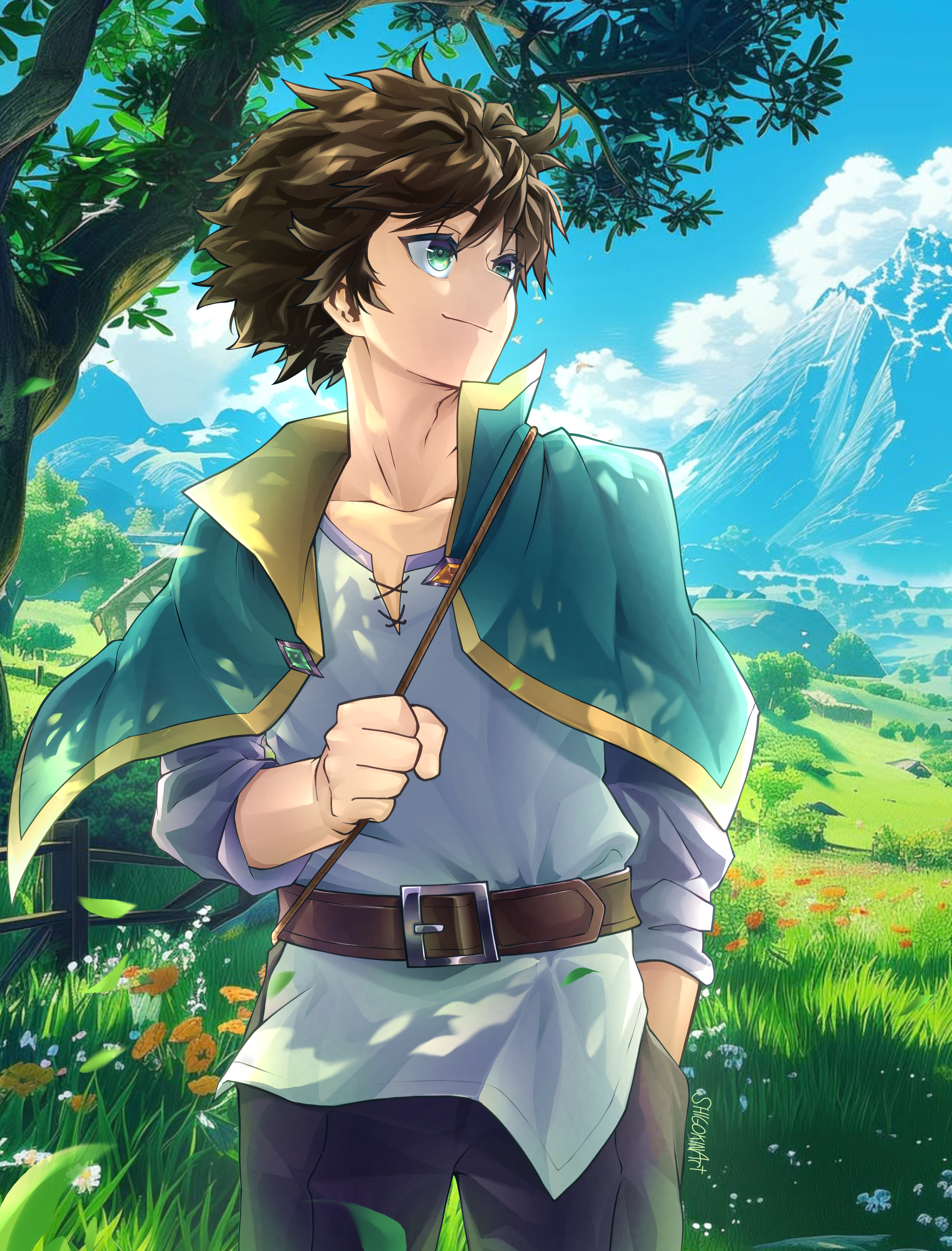 1boy absurdres belt black_pants brown_hair capelet closed_mouth collarbone commentary cowboy_shot day eeferthetraveler english_commentary grass green_capelet green_eyes hand_in_pocket highres holding kono_subarashii_sekai_ni_shukufuku_wo! long_sleeves looking_to_the_side mountain mountainous_horizon nature outdoors pants profile satou_kazuma shirt short_hair signature sky solo tree white_shirt