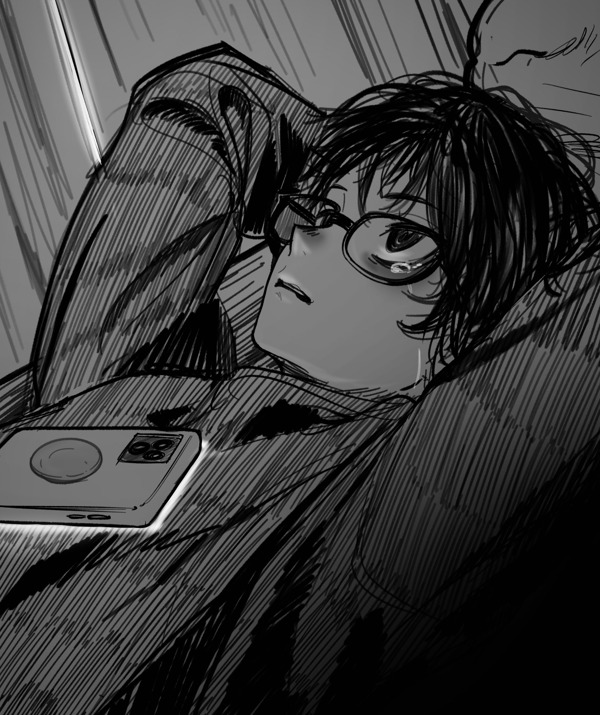 1girl absurdres arms_behind_head bags_under_eyes cellphone crying crying_with_eyes_open glasses greyscale highres jacket long_sleeves lying male_focus messy_hair monochrome on_back original phone saitama_(antitankromeo) sketch smartphone solo tears upper_body