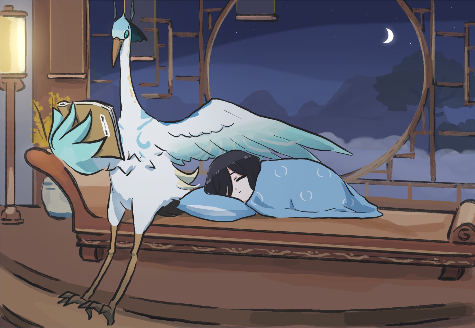 aged_down bird bird_wings black_hair blanket book closed_eyes cloud_retainer_(genshin_impact) commentary_request crane_(animal) crescent_moon genshin_impact highres long_hair moon night pillow reading shenhe_(genshin_impact) shenhe_(young)_(genshin_impact) sky sleeping wings xianyun_(genshin_impact) xinzoruo