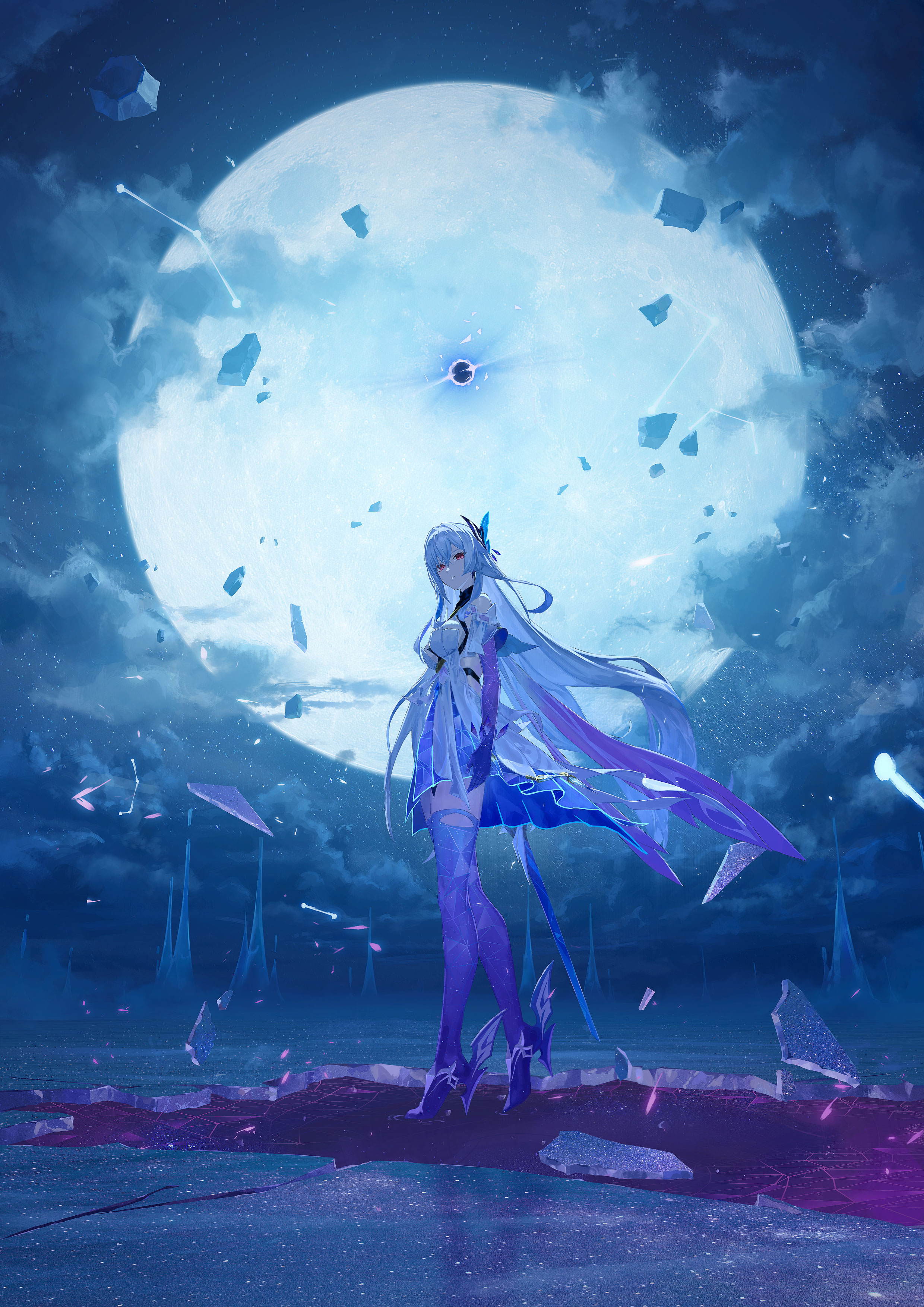 1girl absurdres bare_shoulders breasts cloud cloudy_sky crossed_bangs dress full_body full_moon genshin_impact grey_hair gyoukan_(jfxc) hair_between_eyes hair_ornament high_heels highres ice long_hair looking_at_viewer medium_breasts moon night shards skirk_(genshin_impact) sky star_(sky) starry_sky white_dress