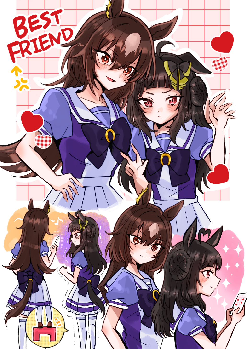 2girls ahoge breasts brown_hair chair closed_mouth collarbone english_text hair_between_eyes hair_ornament heart height_difference highres horse_girl long_hair medium_breasts mimoe multiple_girls red_eyes ribbon school_uniform shaking sirius_symboli_(umamusume) smile standing umamusume umamusume:_cinderella_gray v