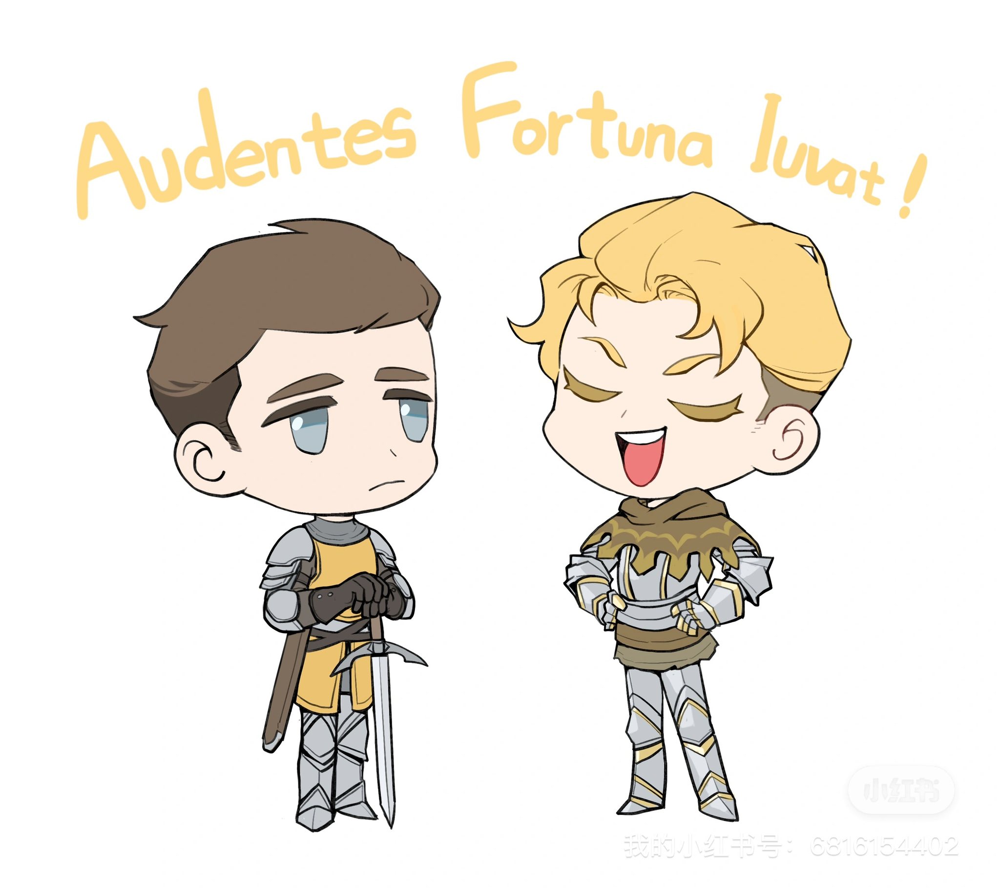 2boys armor armored_gloves black_gloves blonde_hair blue_eyes breastplate brown_cape brown_hair cape chibi chinese_text closed_eyes closed_mouth commentary english_commentary frown full_armor full_body gloves hands_on_own_hips hans_capon hashtag-only_commentary henry_of_skalitz highres holding holding_sword holding_weapon kingdom_come:_deliverance_ii knee_armor latin_text leg_armor looking_at_another male_focus multiple_boys open_mouth own_hands_together sabaton scabbard sheath short_hair shoulder_armor simple_background standing sword untranslatable_commentary teeth tongue tworain_w upper_teeth_only watermark weapon white_background