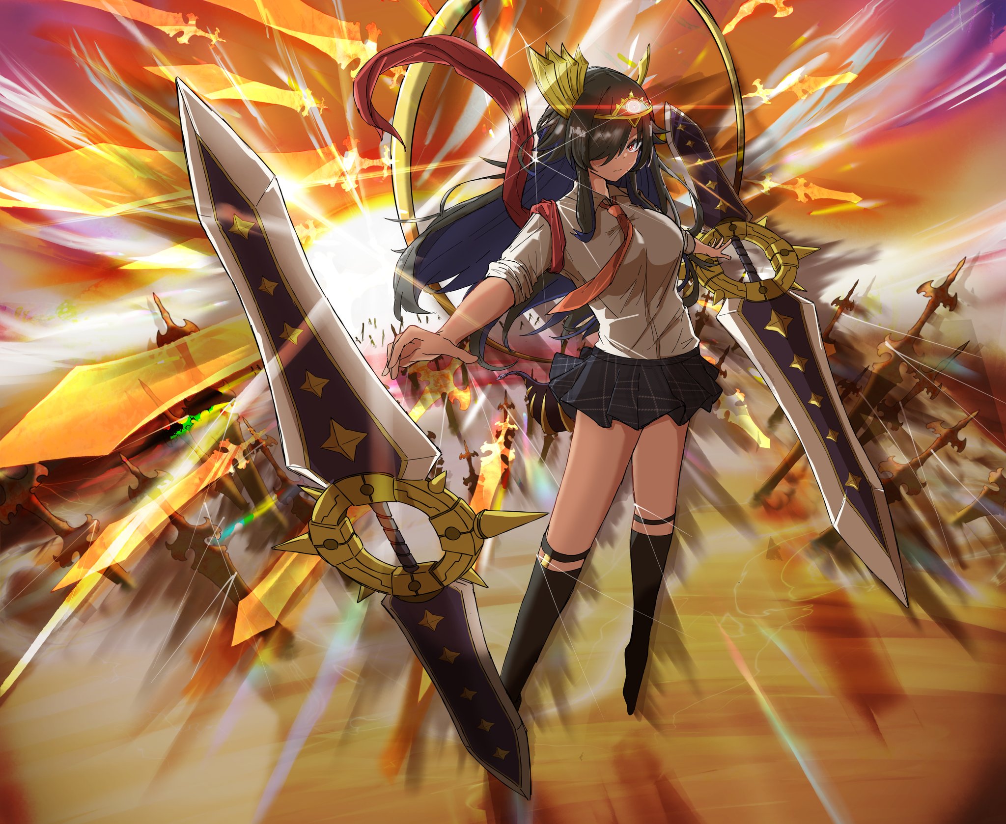 1girl black_hair black_thighhighs breasts closed_mouth commission dark-skinned_female dark_skin dragon_girl dragon_horns dragon_musume_ni_naritakunai! dragon_tail duel_masters expressionless eyewear_on_head glowing glowing_eye gradient_background hair_ornament highres horns large_breasts long_hair looking_at_viewer necktie orange_background orange_eyes orange_necktie orange_scarf pleated_skirt red_necktie sava_k_zeos scarf school_uniform shirt sidelocks skeb_commission skirt sleeves_rolled_up solo sparkle standing sword tail thighhighs third_eye tomin_(tomin0222) weapon white_shirt