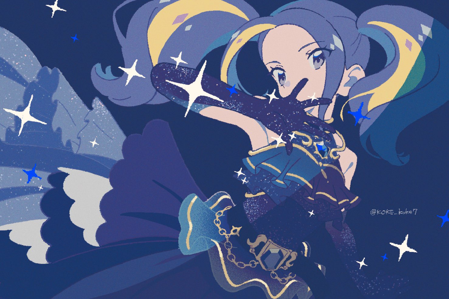1girl aikatsu!_(series) aikatsu_planet! armpits artist_name belt black_belt blending blonde_hair blue_background dress elbow_gloves frilled_dress frills gloves idol idol_clothes jewelry koke_(koke7) long_dress looking_at_viewer medium_hair print_gloves purple_dress purple_eyes purple_gloves purple_hair ruli_(aikatsu_planet!) sleeveless sleeveless_dress solo sparkle starry_sky_print twintails twitter_username