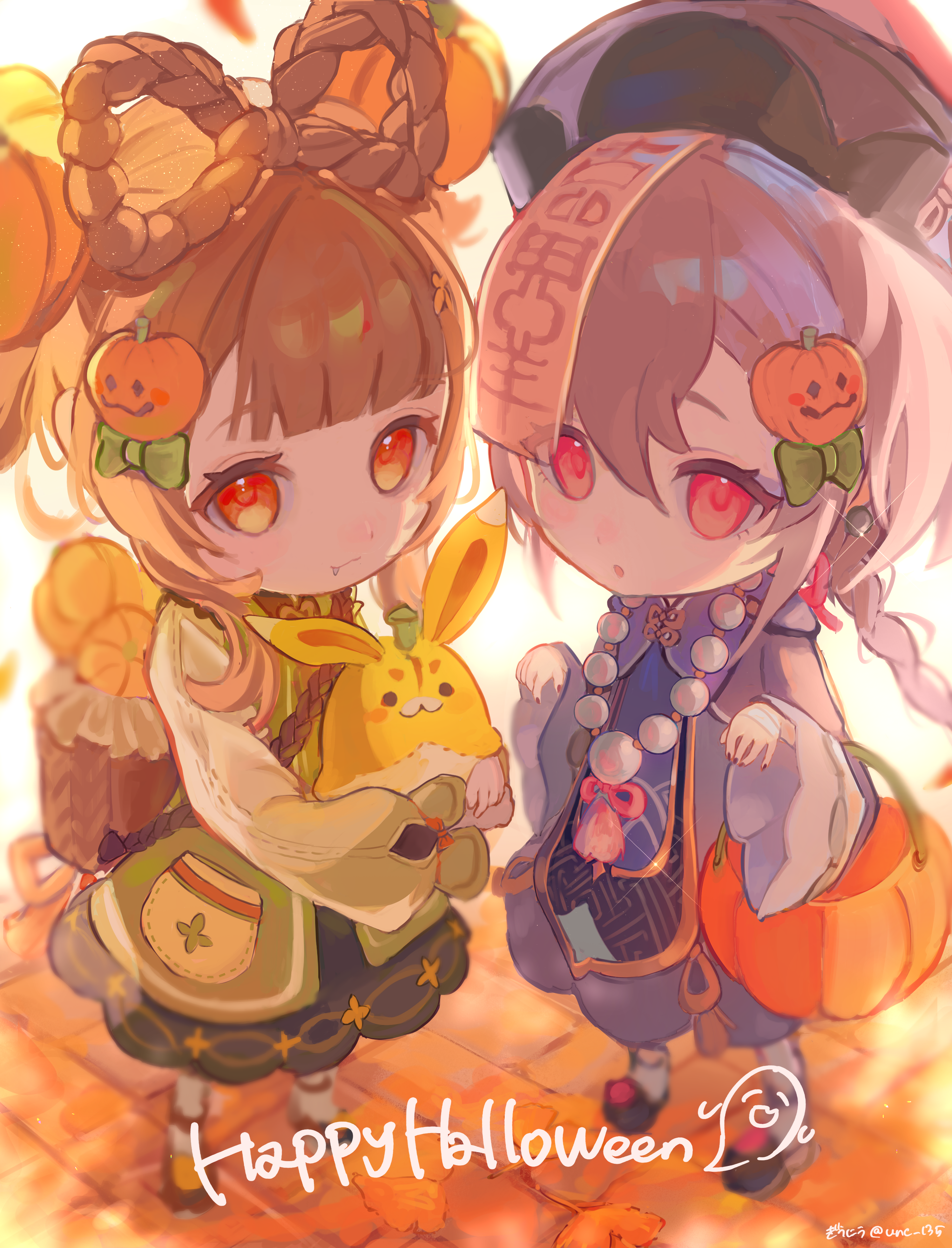 2girls absurdres animal artist_name bag bead_necklace beads black_shoes bow bow-shaped_hair braid braided_ponytail brown_bag brown_hair brown_shoes child closed_mouth commentary commentary_request dress english_commentary fang fang_out food-themed_hair_ornament full_body genshin_impact giuniu_(unc_135) green_bow green_dress hair_between_eyes hair_bow hair_ornament halloween_bucket happy_halloween hat highres holding holding_animal jewelry long_hair long_sleeves looking_at_viewer mixed-language_commentary multiple_girls necklace ofuda ofuda_on_head orange_eyes pantyhose pumpkin_hair_ornament purple_dress purple_hair purple_hat qingdai_guanmao qiqi_(genshin_impact) shoes short_hair shoulder_bag smile socks standing white_pantyhose white_socks wide_sleeves yaoyao_(genshin_impact)