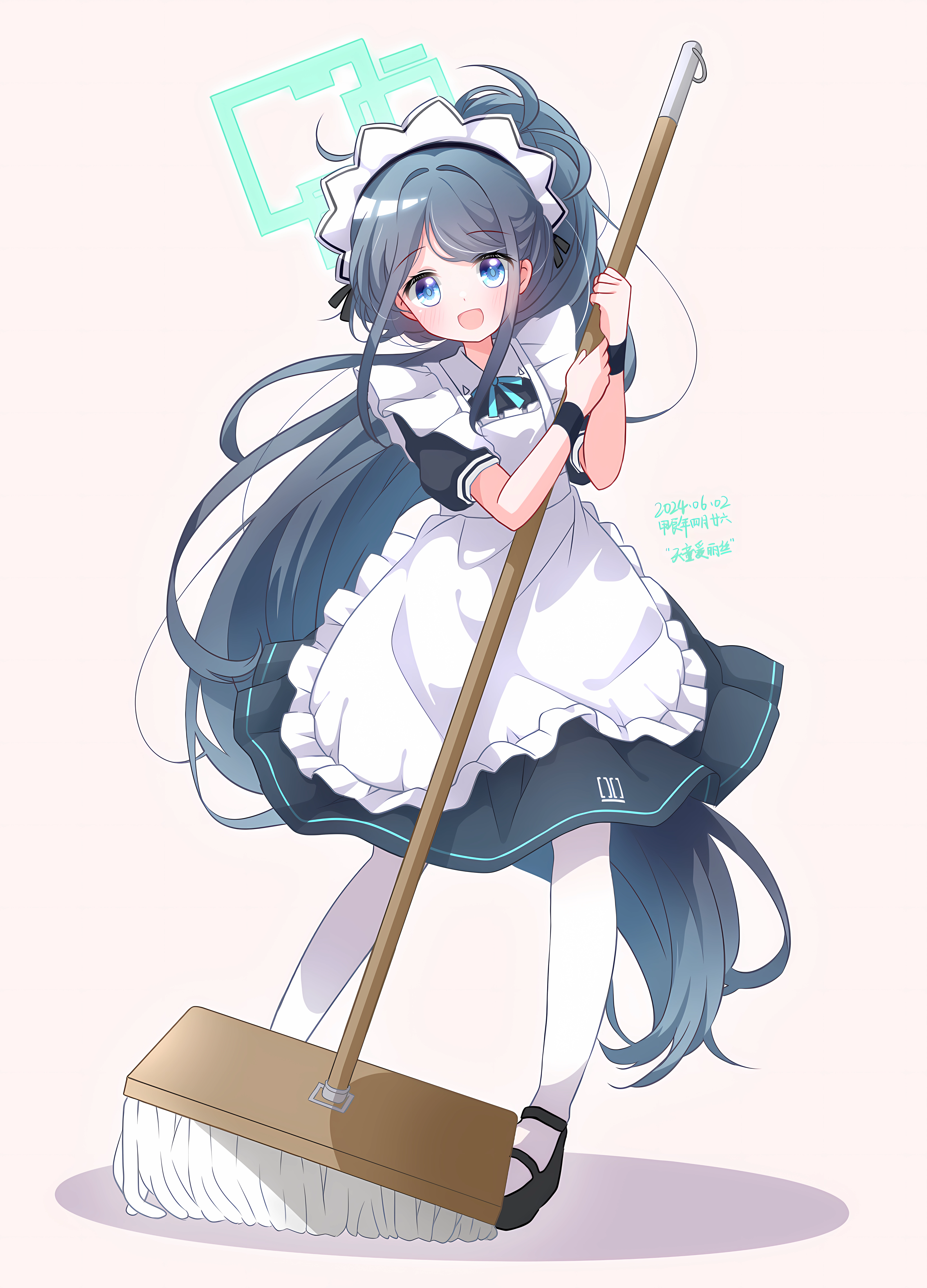 1girl :d absurdly_long_hair absurdres apron aqua_halo aqua_ribbon aris_(blue_archive) aris_(maid)_(blue_archive) black_dress black_shoes black_wrist_cuffs blue_archive blue_eyes blush brown_background character_name chinese_commentary collared_dress commentary_request contrast_collar dated dress floating_hair frilled_apron frills full_body grey_hair halo high_ponytail highres holding holding_mop long_hair looking_at_viewer maid maid_apron maid_headdress mary_janes mop neck_ribbon number_print official_alternate_costume official_alternate_hairstyle open_mouth pantyhose parted_bangs ponytail puffy_short_sleeves puffy_sleeves rectangular_halo ribbon shadow shoes short_sleeves sidelocks simple_background smile solo southernsandbox standing very_long_hair white_apron white_headdress white_pantyhose wrist_cuffs