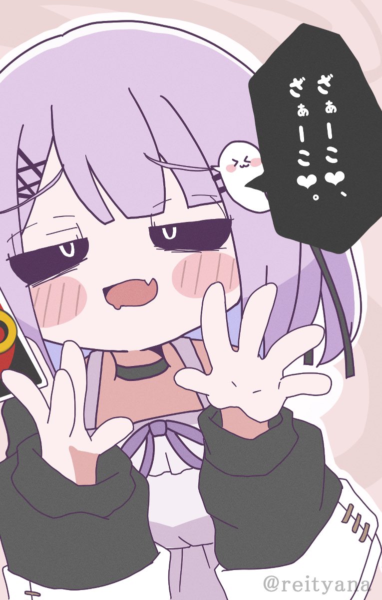 1girl blush choker drooling fang ghost_hair_ornament grey_choker hair_ornament highres looking_at_viewer mimukauwa_nice_try_(vocaloid) mouth_drool open_mouth purple_hair reityana shinomiya_runa shinomiya_runa_(1st_costume) skin_fang solo speech_bubble twitter_username virtual_youtuber vspo!